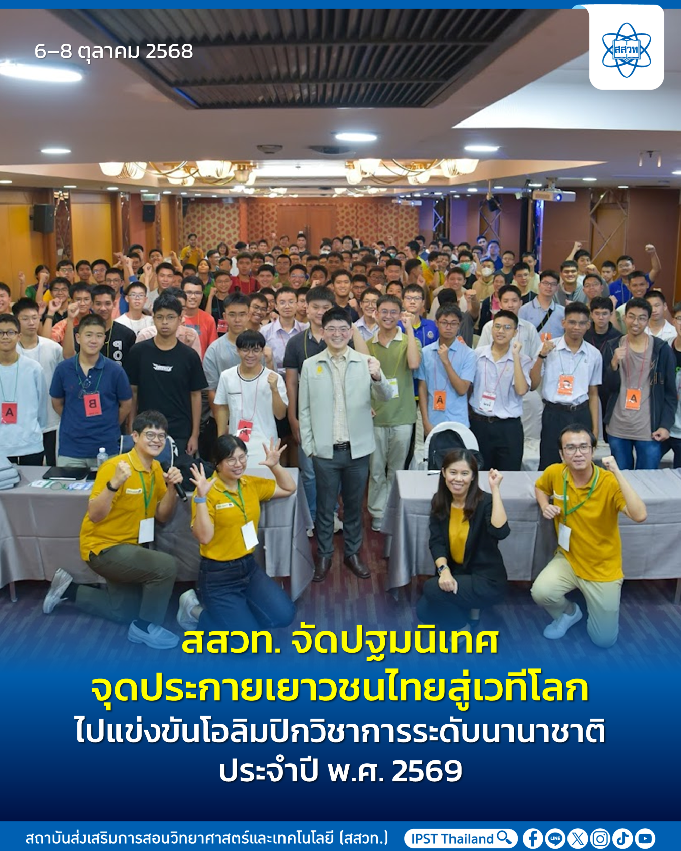สถาบันส่งเสริมการสอนวิทยาศาสตร์และเทคโนโลยี (สสวท.) จัดปฐมนิเทศการอบรมคัดเลือก ครั้งที่ 1 โครงการจัดส่งผู้แทนประเทศไทยไปแข่งขันคณิตศาสตร์ วิทยาศาสตร์โอลิมปิกระหว่างประเทศ ประจำปี พ.ศ. 2569 ระหว่างวันที่ 6–8 ตุลาคม 2568 ณ โรงแรมแกรนด์ ทาวน์เวอร์อินน์ กรุงเทพฯ โดยมี รองศาสตราจารย์ ดร.ธีระเดช เจียรสุขสกุล ผู้อำนวยการ สสวท. เป็นประธาน เปิดการอบรม พร้อมกล่าวให้โอวาทและแนะแนวทางการพัฒนาเยาวชนไทยให้มีศักยภาพด้านวิทยาศาสตร์และเทคโนโลยีอย่างรอบด้าน พร้อมด้วย นางสาวรัชดา ยาตรา ผู้อำนวยการฝ่ายโอลิมปิกวิชาการและอัจฉริยภาพ เจ้าหน้าที่ สสวท. และนักเรียนที่ผ่านการคัดเลือกจากทั่วประเทศเข้าร่วมกิจกรรมการปฐมนเทศ กว่า 120 คน ที่ประกอบด้วยนักเรียนวิชาคณิตศาสตร์ คอมพิวเตอร์ เคมี และฟิสิกส์ เพื่อเตรียมความพร้อมด้านความรู้ ทักษะ และทัศนคติที่จำเป็นต่อการเป็นตัวแทนประเทศไทยในเวทีระดับนานาชาติ รวมถึงชี้แจง รายละเอียการอบรมคัดเลือก ครั้งที่ 1 และการประชาสัมพันธ์ทุนโอลิมปิกวิชาการฯ ในครั้งนี้ด้วย