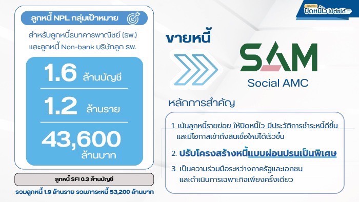 “เราจะเร่งแก้หนี้เสียกลุ่มแรกก่อน ภายใต้ระยะเวลาของรัฐบาลใน 4 เดือน ซึ่งการโอนกรรมสิทธิ์หนี้ไปให้ AMC ของ SAM บริหาร จะช่วยพวกเขาลดภาระหนี้ มีประวัติในเครดิตบูโรดีขึ้น และเปิดทางให้สามารถกลับเข้าไปในระบบสินเชื่อได้ ถือเป็นการคืนชีวิตให้กับลูกหนี้และคนในครอบครัวของพวกเขาให้กลับมามีโอกาสทางเศรษฐกิจอีกครั้ง” ดร.เอกนิติ กล่าว
