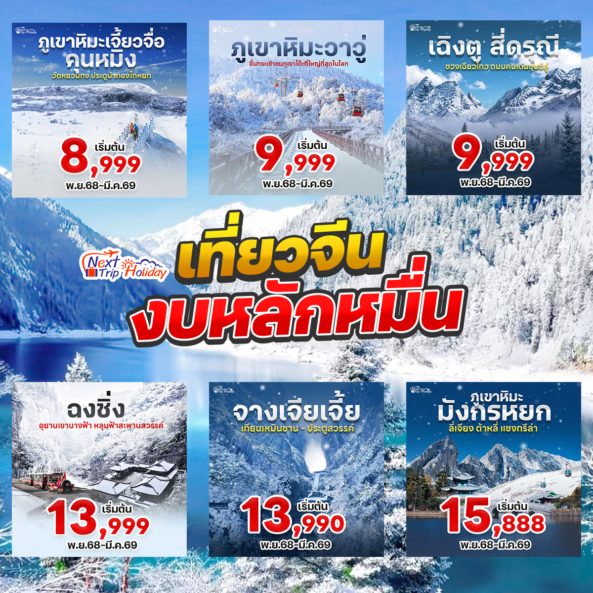 Next Trip Holiday เดินหน้าจับเทรนด์ท่องเที่ยวฤดูหนาว เปิดตัวแคมเปญใหญ่ “เที่ยวจีน งบไม่เกินหมื่น” รวมเส้นทางท่องเที่ยวยอดนิยมช่วงหิมะโปรยทั่วประเทศจีน สำหรับนักเดินทางที่ต้องการสัมผัสบรรยากาศหิมะใกล้ประเทศไทยในราคาสบายกระเป๋า เริ่มต้นเพียง 8,999 บาท เดินทางได้ตั้งแต่ พฤศจิกายน 2568 - มีนาคม 2569