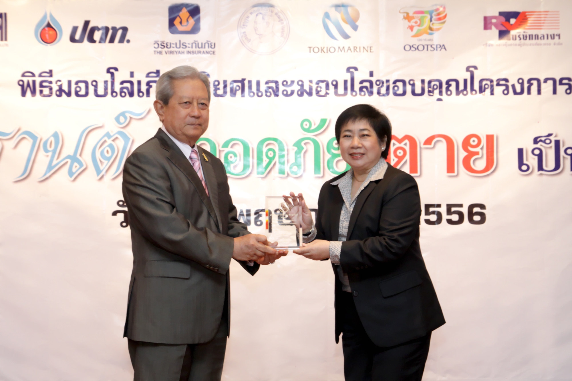 พลเอกสุรยุทธ์ จุลานนท์ องคมนตรีและประธานมูลนิธิรัฐบุรุษพลเอกเปรม ติณสูลานนท์ มอบโล่ขอบคุณแก่ นางสาวกานดา วัฒนายิ่งสมสุข ผู้จัดการฝ่ายสื่อสารองค์กร บริษัท วิริยะประกันภัย จำกัด ( มหาชน ) ในฐานะบริษัทฯ เป็นองค์กรเอกชนที่ร่วมสนับสนุนการดำเนินงานป้องกันไม่ให้มีผู้เสียชีวิตจากอุบัติเหตุทางถนน ตามโครงการ “สงกรานต์ปลอดภัย ตายเป็นศูนย์” ประจำปี 2556 ณ ห้องประชุมพลเอกเปรม ติณสูลานนท์ มูลนิธิรัฐบุรุษฯ ถนนอู่ทองนอก เขตดุสิต กรุงเทพฯ