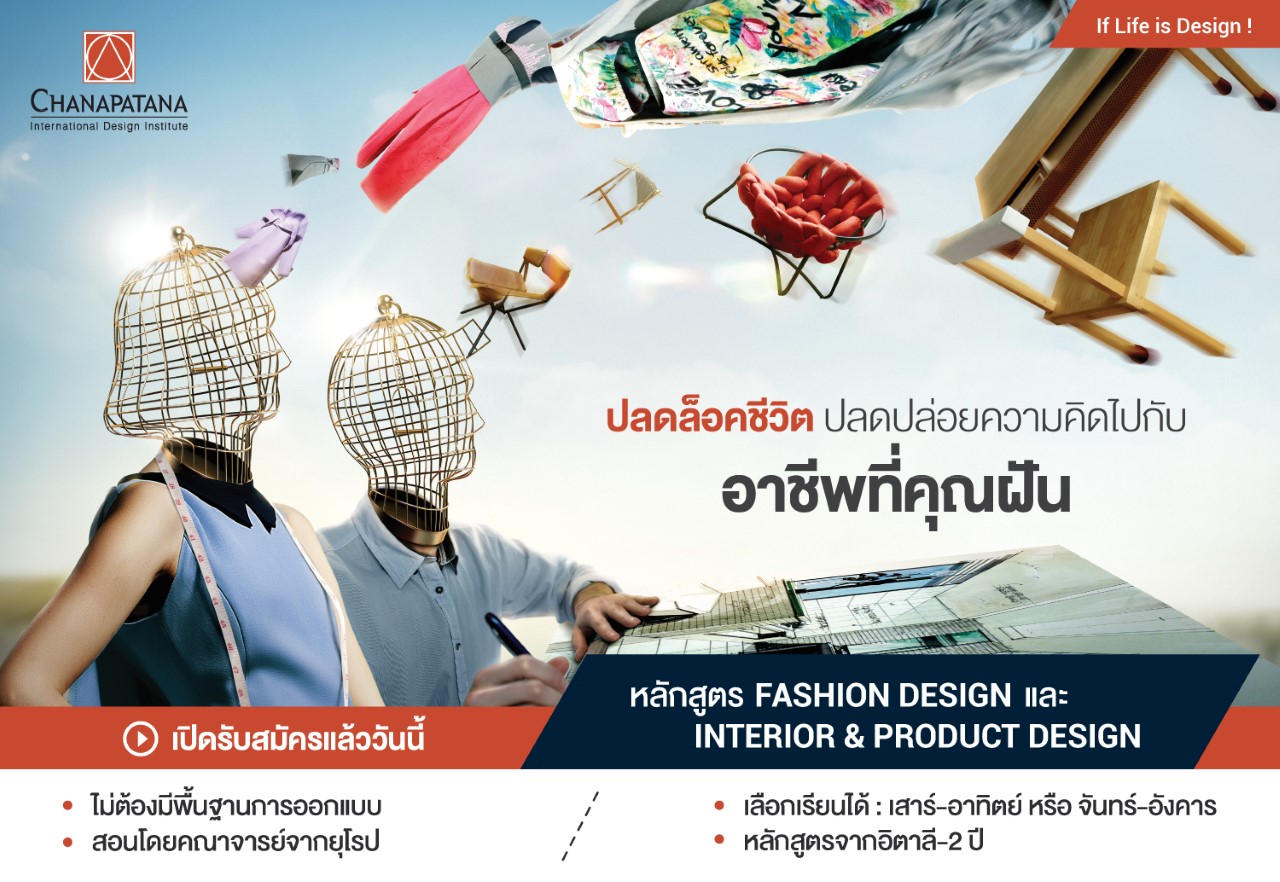 สถาบันออกแบบนานาชาติชนาพัฒน์ ขอเชิญผู้มีใจรักด้านงานออกแบบ ร่วมปลดล็อคชีวิต ปลดปล่อยความคิดไปกับอาชีพที่คุณฝัน ด้วยหลักสูตร 2 ปีจากประเทศอิตาลี สาขาออกแบบแฟชั่น (Fashion Design) และสาขาออกแบบตกแต่งภายในและผลิตภัณฑ์ (Interior & Product Design) เลือกเรียนได้วันเสาร์ - อาทิตย์ หรือ จันทร์ – อังคาร ไม่จำเป็นต้องมีพื้นฐานด้านการออกแบบมาก่อน สอนเป็นภาษาอังกฤษ โดยคณาจารย์ที่มีประสบการณ์ในวงการออกแบบจากยุโรป เปิดรับสมัครแล้ววันนี้ สอบถามรายละเอียดเพิ่มเติม หรือสำรองที่นั่งโดยไมมีค่าใช้จ่าย เพื่อเข้าฟังการแนะนำหลักสูตร ชมผลงานนักศึกษา และพูดคุยกับศิษย์เก่าที่สร้างแบรนด์และเข้าสู่วงการออกแบบในงาน CIDI Chanapatana Open House วันเสาร์ที่ 23 กรกฎาคม และ 6 สิงหาคม 2559 เวลา 10.00 – 12.00 น. โทร. 02-741-3717-8 และ www.chanapatana.com