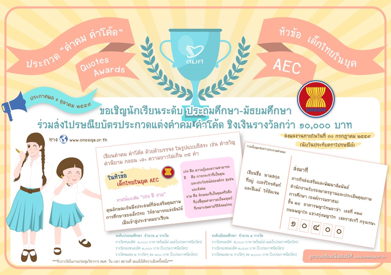 สำนักงานรับรองมาตรฐานและประเมินคุณภาพการศึกษา (องค์การมหาชน) หรือ สมศ. เชิญชวนนักเรียน ระดับประถมศึกษา มัธยมศึกษา ร่วมโครงการ คำคม คำโค๊ด ในหัวข้อ 'เด็กไทยในยุค AEC' ภายใต้แนวคิด เก่ง ดี งาม เพียงเขียนคำคม ลงไปรษณียบัตรด้วยตัวบรรจงในรูปแบบอิสระ เช่น คำขวัญ คำนิยาม กลอน ฯลฯ ความยาวไม่เกิน 35 คำ บรรยายถึงคุณลักษณะที่พึงประสงค์ 3 ประการ คือ คุณภาพ คุณธรรม คุณลักษณ์ โดยคุณภาพมองที่ความรู้ คุณธรรมพิจารณา คุณประโยชน์ต่อสังคม และคุณลักษณ์จากความเหมาะสมตามวิถีสังคมไทย