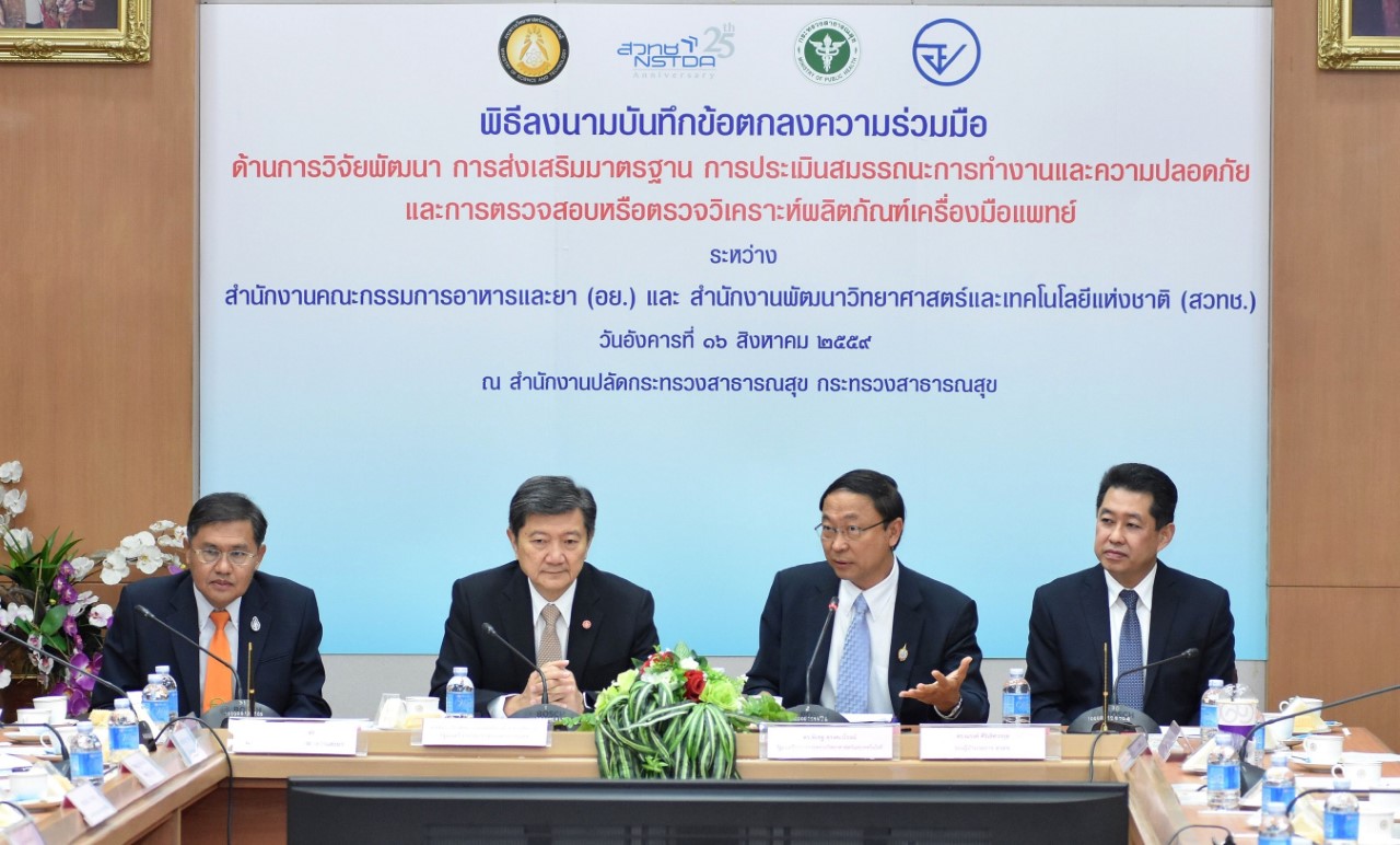 (16 ส.ค. 59) ณ สำนักงานปลัดกระทรวงสาธารณสุข : อย. เดินหน้าบูรณาการจับมือ สวทช. รุดสนองนโยบายรัฐ ลงนาม MOU ทำข้อตกลงร่วมมือกันด้านการวิจัยพัฒนา การประเมินสมรรถนะการทำงาน ความปลอดภัย และการตรวจสอบหรือตรวจวิเคราะห์ผลิตภัณฑ์เครื่องมือแพทย์ เพิ่มศักยภาพในการแข่งขันทางเศรษฐกิจในยุคประชาคมเศรษฐกิจอาเซียน โดยได้รับเกียรติจาก ศ.คลินิก เกียรติคุณ นพ.ปิยะสกล สกลสัตยาทร รัฐมนตรีว่าการกระทรวงสาธารณสุข และนายพิเชฐ ดุรงคเวโรจน์ รัฐมนตรีว่าการกระทรวงวิทยาศาสตร์และเทคโนโลยี เป็นสักขีพยาน
