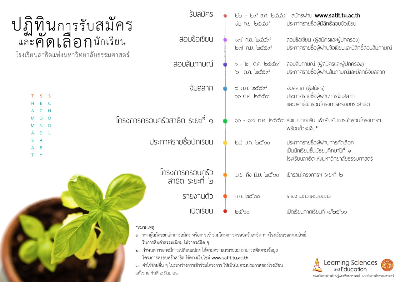 ทั้งนี้ ผู้ปกครองและนักเรียนสามารถตรวจสอบคุณสมบัติและสมัครสอบออนไลน์ได้ ระหว่างวันที่ 22-29 สิงหาคม 2559 ที่เว็บไซต์http://www.satit.tu.ac.th/ โดยจะประกาศรายชื่อผู้มีสิทธิ์สอบสัมภาษณ์ในวันจันทร์ที่ 12 กันยายน 2559