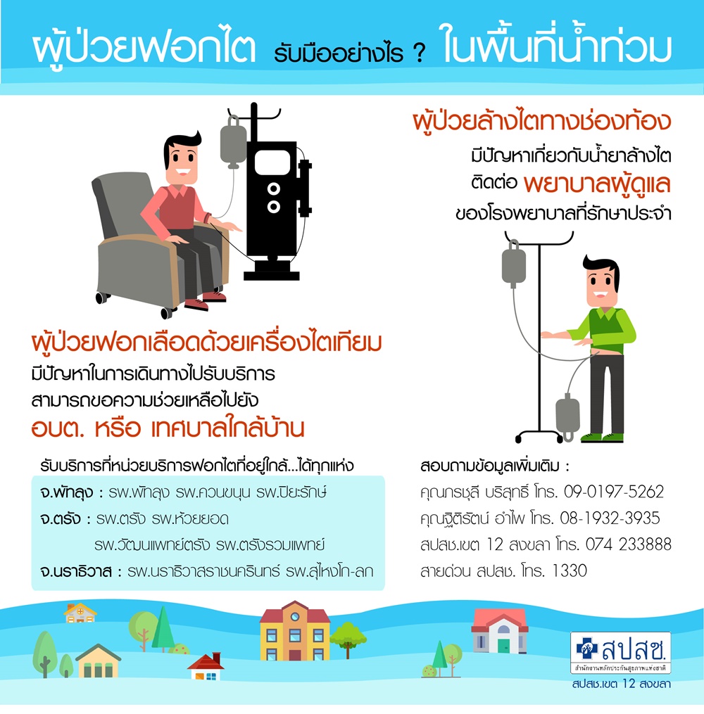 นพ.ศักดิ์ชัย กล่าวว่า กรณีผู้ป่วยไตที่ต้องรับการฟอกเลือด สปสช.ได้ประสานงาน อบต.และเทศบาลให้ความช่วยเหลือในการเดินทางออกจากพื้นที่ไปยังหน่วยบริการฟอกเลือดที่อยู่ใกล้เคียงแทน รวมถึงการเข้ามาพักใกล้ รพ.ที่ฟอกไตจนกว่าสถานการณ์จะคลี่คลาย สำหรับภาคใต้ตอนล่าง สปสช.เขต 12 สงขลา แจ้ง รพ.ที่สามารถฟอกเลือดได้ ที่ จ.พัทลุง ได้แก่ รพ.พัทลุง รพ.ควนขนุน และ รพ.ปิยะรัตน์ ที่ จ.ตรัง ได้แก่ รพ.ตรัง รพ.ห้วยยอด รพ.วัฒนแพทย์ตรัง และ รพ.ตรังรวมแพทย์ ขณะที่ภาคใต้ตอนบน ที่ อ.หลังสวน จ.ชุมพร ประสบเหตุอุทกภัยอย่างหนัก ทำให้หน่วยไตเทียม รพ.หลังสวน และหน่วยไตเทียมหลังสวน (คลินิกเอกชน) ได้ปิดบริการ สปสช.เขต 11 สุราษฎร์ธานี จึงส่งตัวผู้ป่วยไตวายเรื้อรังระยะสุดท้ายในระบบหลักประกันสุขภาพแห่งชาติ ไปรับบริการที่ รพ.ชุมพรเขตรอุดมศักดิ์ และ รพ.เอกชนใน จ.ชุมพรแล้ว