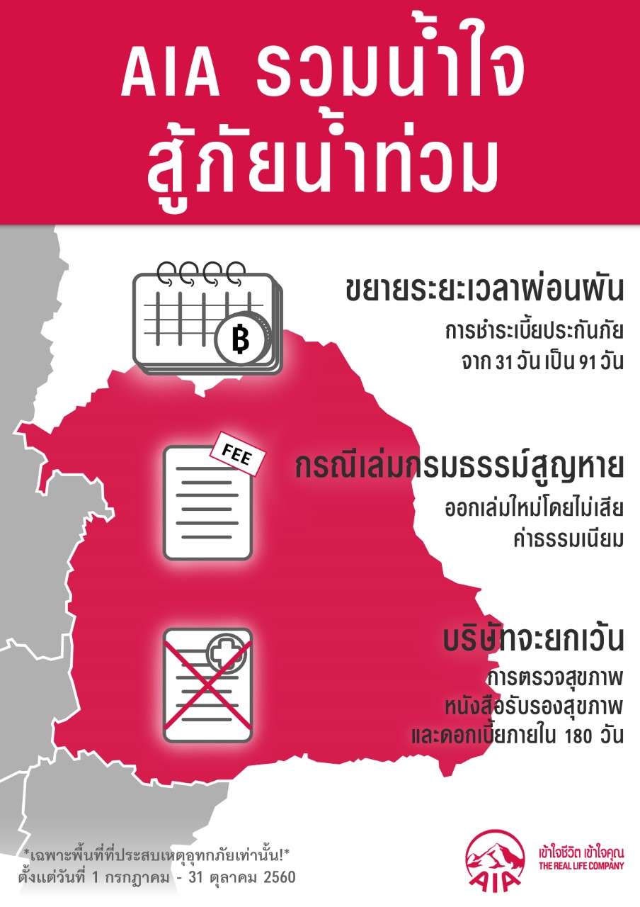 เอไอเอ ประเทศไทย เดินหน้ามอบความช่วยเหลือผู้ประสบอุทกภัยทางภาคอีสาน โดยล่าสุดสถานการณ์ยังคงมีน้ำท่วมขังอยู่ในหลายพื้นที่ ซึ่งได้ส่งผลกระทบต่อทั้งสภาพร่างกายและสภาพจิตใจ รวมไปถึงความปลอดภัย และความเดือดร้อนทางการเงินแก่ประชาชน ด้วยความห่วงใยในความเดือดร้อนของคนไทย เอไอเอ ประเทศไทย จึงได้ออกมาตรการช่วยบรรเทาความเดือดร้อนและแบ่งเบาภาระของลูกค้าที่อาศัยอยู่ในเขตพื้นที่จังหวัดที่ประสบอุทกภัย ผ่านโครงการ “เอไอเอรวมน้ำใจ สู้ภัยน้ำท่วม” เพื่อมุ่งช่วยเหลือให้ลูกค้าเอไอเอได้รับความคุ้มครองตามกรมธรรม์ พร้อมได้รับสิทธิพิเศษเพิ่มเติม โดยรายละเอียดดังนี้