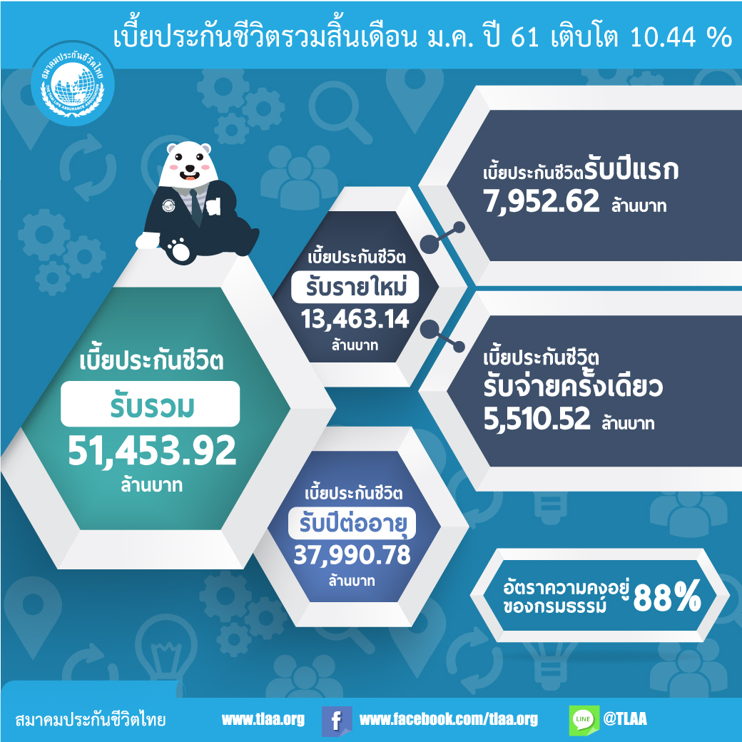 นายพิชา สิริโยธิน ผู้อำนวยการบริหารสมาคมประกันชีวิตไทย เปิดเผยว่า เบี้ยประกันชีวิตรับรวม ณ สิ้นเดือนมกราคม 2561 มีทั้งสิ้น 51,453.92 ล้านบาท อัตราการเติบโตเพิ่มขึ้นจากช่วงเวลาเดียวกันของปีก่อนร้อยละ 10.44 จำแนกเป็นเบี้ยประกันชีวิตรับรายใหม่จำนวน 13,463.14 ล้านบาท และเบี้ยประกันชีวิตรับปีต่อไปจำนวน 37,990.78 ล้านบาท อัตราความคงอยู่ร้อยละ 88