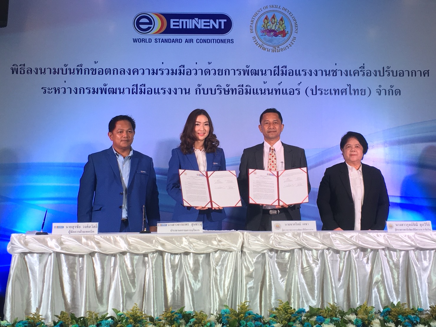 นายชาคริตย์ เดชา ผู้ตรวจราชการกพร. ในฐานะตัวแทนของกพร. ในการลงนามความร่วมมือ กล่าวว่าล่าสุดกพร. ได้ลงนามความร่วมมือกับบริษัท อีมิแน้นท์แอร์ (ประเทศไทย) จำกัด ในการพัฒนาฝีมือแรงงานช่างเครื่องปรับอากาศ ณ Eminent Exploring Center จังหวัดเชียงใหม่ แนวทางจะร่วมมือกันพัฒนาหลักสูตรฝึกอบรมสาขาการติดตั้งเครื่องปรับอากาศภายในบ้านและการพาณิชย์ด้วยระบบอินเวอร์เตอร์ และดำเนินการจัดฝึกอบรมนำร่องในพื้นที่ 8 จังหวัด ได้แก่ เชียงใหม่ สมุทรปราการ สงขลา นครศรีธรรมราช ภูเก็ต นครราชสีมา อุดรธานี และอุบลราชธานี ในการพัฒนาศักยภาพช่างฝีมือในพื้นที่ มีการเรียนรู้ทั้งภาคทฤษฎีและปฏิบัติภายใต้หัวข้อความปลอดภัยในการทำงาน งานท่อในเครื่องปรับอากาศ การทำงานของวงจรไฟฟ้า วงจรอินเวอร์เตอร์ สารทำความเย็น การติดตั้งและการทดสอบการทำงานของเครื่องปรับอากาศ เป็นต้น ฝึกอบรมจำนวน 10 รุ่น รวม 200 คน โดยการกระจายฝึกอบรมทั่วประเทศ ส่วนความร่วมมืออื่นๆ จะมีการพัฒนาครูฝึกกพร. ในการเป็นวิทยากรถ่ายทอดความรู้ให้แก่ช่างชุมชน ช่างในสถานประกอบกิจการ ผู้มีรายได้น้อย และประชาชนทั่วไป