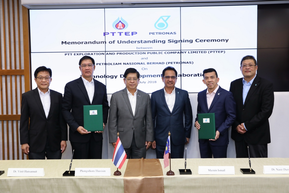 นายพงศธร ทวีสิน (ที่ 2 จากซ้าย) กรรมการผู้จัดการใหญ่ สำรวจและผลิตปิโตรเลียม บริษัท ปตท.สำรวจและผลิตปิโตรเลียม จำกัด (มหาชน) หรือ ปตท.สผ. ลงนามบันทึกความเข้าใจ (MoU) ร่วมกับนายมาซูอิน บิน อิสมาอิล (ที่ 2 จากซ้าย) Senior Vice President, Project Delivery & Technology บริษัท ปิโตรเลียม เนชั่นแนล เบอร์ฮาด หรือ ปิโตรนาส (Petroliam Nasional Berhad หรือ PETRONAS) เพื่อร่วมมือกันในการพัฒนาเทคโนโลยีสำหรับกิจกรรมสำรวจและผลิตปิโตรเลียม พิธีลงนามจัดขึ้นที่อนันตรา เชียงใหม่ รีสอร์ท โดยมีนายเทวินทร์ วงศ์วานิช (ที่ 3 จากซ้าย) ประธานเจ้าหน้าที่บริหารและกรรมการผู้จัดการใหญ่ บริษัท ปตท. จำกัด (มหาชน) และนายตัน ศรี วาน ซุลกิฟลิ วาน อาริฟฟิน (ที่ 3 จากขวา) ประธานเจ้าหน้าที่บริหารและกรรมการผู้จัดการใหญ่ กลุ่มปิโตรนาส ให้เกียรติร่วมในพิธีลงนาม