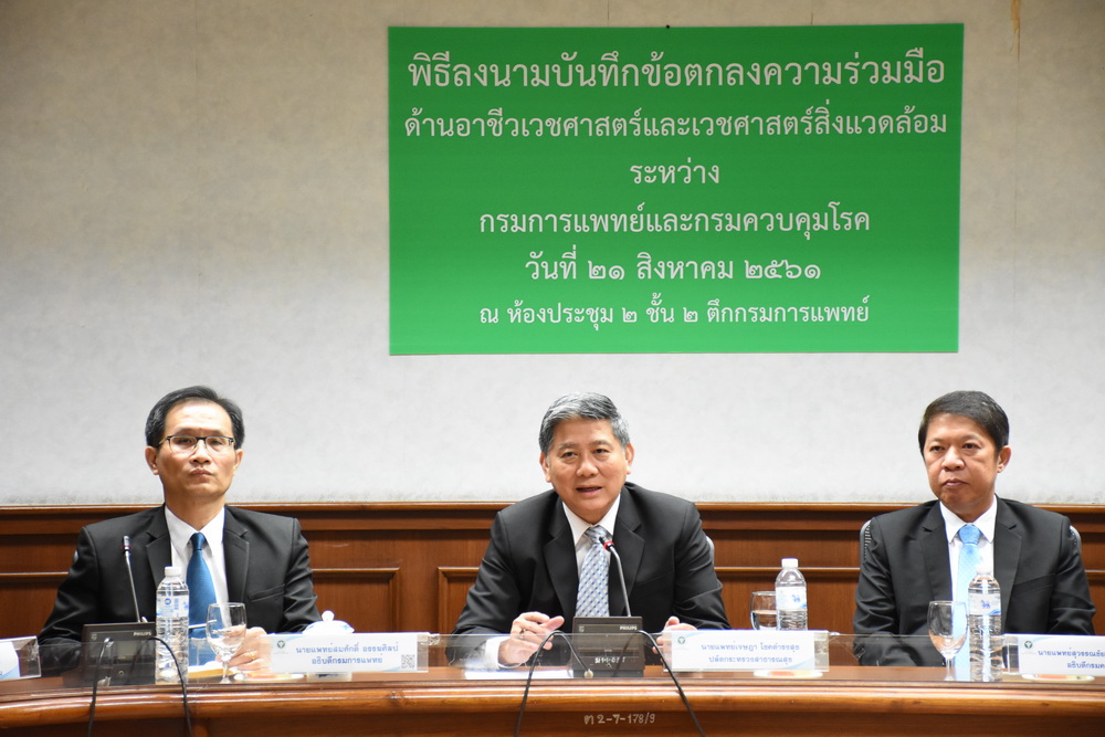 ที่กรมการแพทย์ กระทรวงสาธารณสุข จ.นนทบุรี นพ.เจษฎา โชคดำรงสุข ปลัดกระทรวงสาธารณสุข เป็นประธานพิธีลงนามข้อตกลงความร่วมมือด้านอาชีวเวชศาสตร์และเวชศาสตร์สิ่งแวดล้อม ระหว่างนพ.สมศักดิ์ อรรฆศิลป์ อธิบดีกรมการแพทย์ และนพ.สุวรรณชัย วัฒนายิ่งเจริญชัย อธิบดีกรมควบคุมโรค เพื่อให้เกิดความร่วมมือด้านวิชาการ ทั้งในและต่างประเทศ ทั้งการศึกษาวิจัย การฝึกอบรม การจัดบริการ ให้การดูแลประชาชนกรณีเกิดเหตุการณ์ด้านอาชีวเวชศาสตร์และเวชศาสตร์สิ่งแวดล้อม พัฒนามาตรฐานบริการ และการผลักดันนโยบาย และกฎหมาย ตามพระราชบัญญัติโรคจากการประกอบอาชีพและสิ่งแวดล้อม