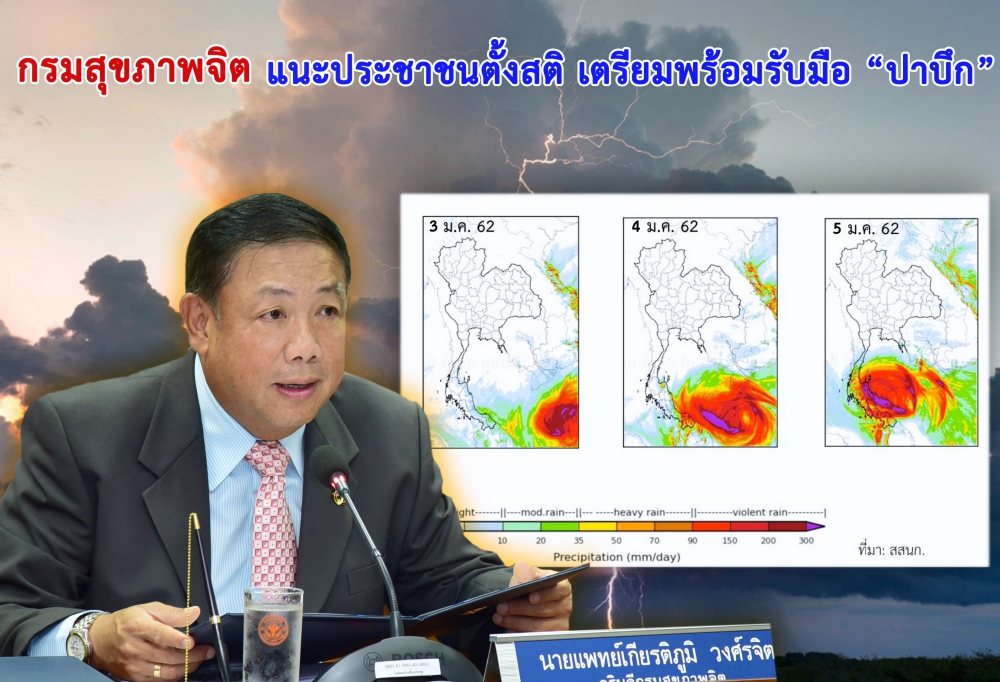 นายแพทย์เกียรติภูมิ วงศ์รจิต อธิบดีกรมสุขภาพจิต ให้สัมภาษณ์เกี่ยวกับกรณี พายุปาบึก ที่กำลังจะเคลื่อนขึ้นฝั่งบริเวณรอยต่อระหว่างจังหวัดชุมพรและสุราษฎร์ธานี ในช่วงค่ำของวันที่ 4 มกราคม 2562 ซึ่งจะมีผลกระทบต่อพื้นที่ภาคใต้ในช่วงระหว่างวันที่ 3-5 มกราคม 2562 ตามประกาศเตือนของกรมอุตุนิยมวิทยา ว่า กรมสุขภาพจิตมีความเป็นห่วงประชาชน เนื่องจากสถานการณ์ภัยพิบัติจากพายุ จะมีผลกระทบต่อสภาพจิตใจประชาชน ส่วนใหญ่อาจเกิดสภาวะเครียด วิตกกังวล วิธีการป้องกันผลกระทบดังกล่าวที่ดีที่สุด คือการเตรียมความพร้อมรับมือไว้ล่วงหน้าทั้งตนเองและครอบครัว จะช่วยลดความสูญเสียต่างๆได้มาก โดยขอให้ประชาชนที่อยู่ในพื้นที่ที่คาดว่าจะได้รับผลกระทบจากพายุในครั้งนี้ อย่าตื่นตระหนก แต่ขอให้ตั้งสติพร้อมรับมือกับผลกระทบที่จะเกิดขึ้น โดยขอให้ประชาชนปฎิบัติ 4 ประการดังนี้