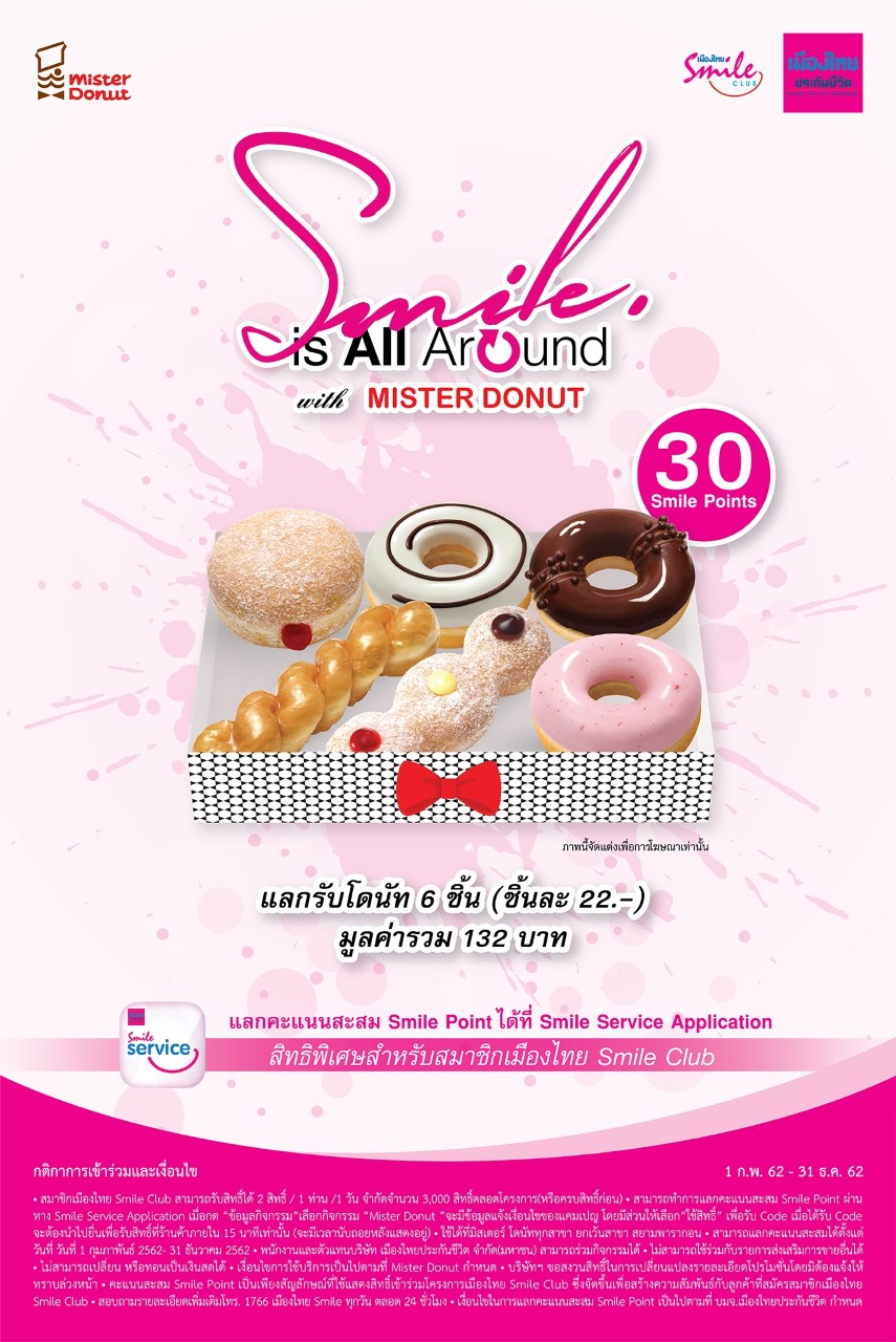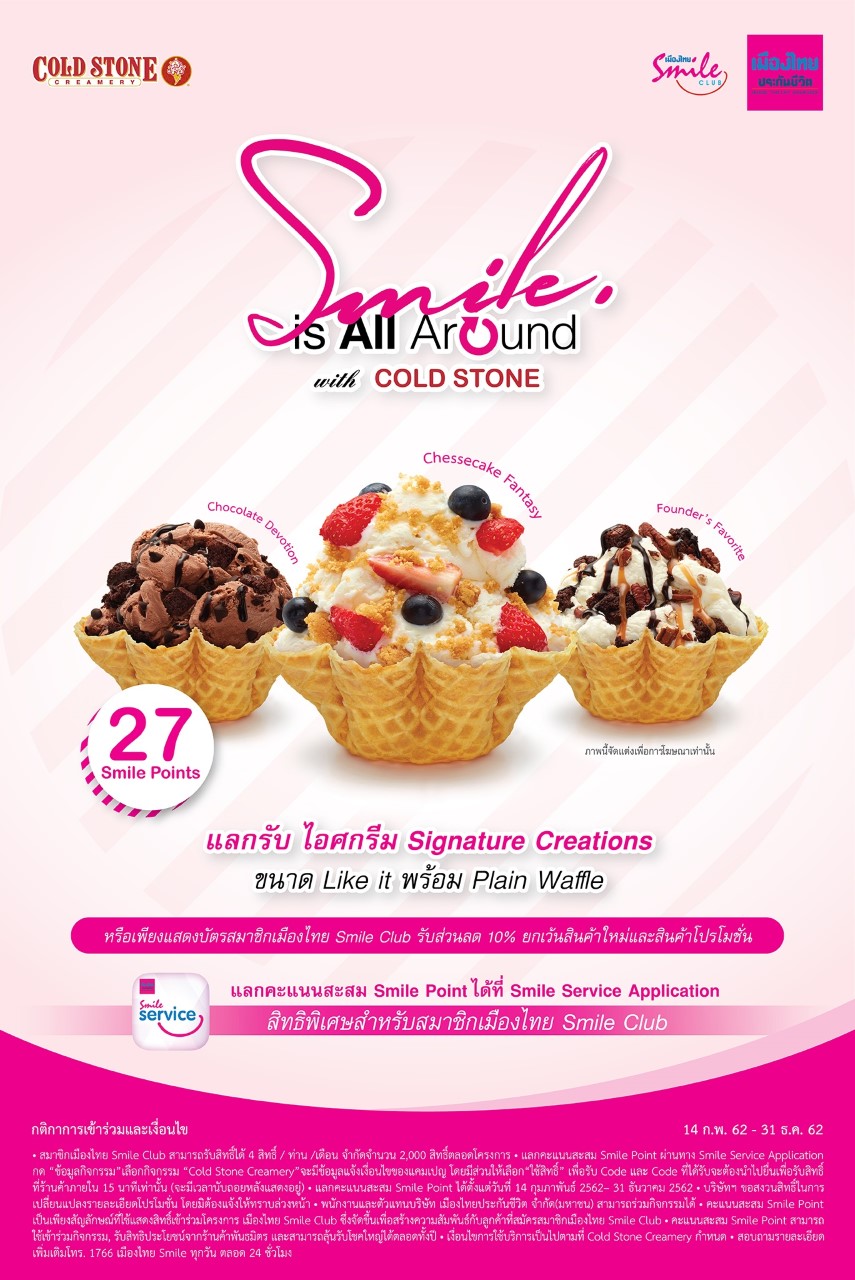 เพื่อเป็นการตอกย้ำภาพลักษณ์แบรนด์แห่งความสุขและรอยยิ้ม ในโอกาสเดือนแห่งความรักเมืองไทย Smile Club ได้มอบความพิเศษตลอดเดือนกุมภาพันธ์กับการคัดสรรกิจกรรมสุดพิเศษชวนสมาชิกฯเติมความหวานแทนคำบอกรัก กับหลากหลายเมนูแสนหวานจากร้านค้าชั้นนำ อาทิ ร้าน Mister Donut เพียงใช้คะแนนสะสม Smile Point 30 คะแนน แลกรับ โดนัท 6 ชิ้น มูลค่ารวม 132 บาท หรือเลือกอร่อยฟินที่ร้าน Cold Stone เพียงใช้คะแนนสะสม Smile Point 27 คะแนน แลกรับไอศกรีม Signature Creations ขนาด Like it พร้อม Plain Waffle หรือแสดงบัตรสมาชิกเมืองไทย Smile Club รับทันที ส่วนลด10%