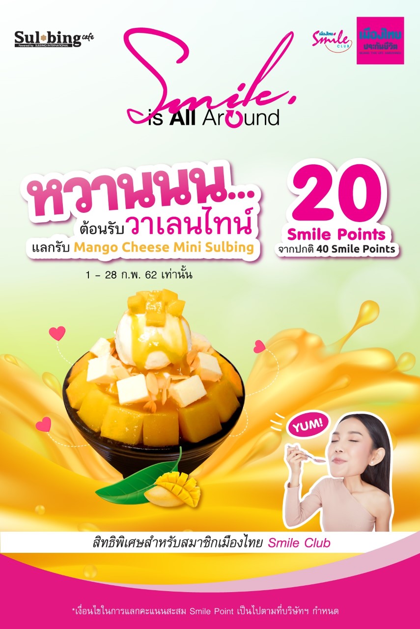 นอกจากนี้ยังมีกิจกรรมเติมความหวานสไตล์เกาหลีที่ร้าน Sulbing เพียงใช้คะแนนสะสม Smile Point 20 คะแนน แลกรับ Mango Cheese Mini Sulbing 1 ถ้วย มูลค่า 170 บาท โดยสมาชิกฯสามารถรับสิทธิ์ผ่านทาง Smile Service Applicationเพื่อรับCode ไปยื่นรับสิทธิ์ที่ร้านค้าภายใน 15 นาที สามารถดูรายละเอียดกิจกรรมและสิทธิประโยชน์ต่างๆ เพิ่มเติมได้ที่ www.muangthai.co.th