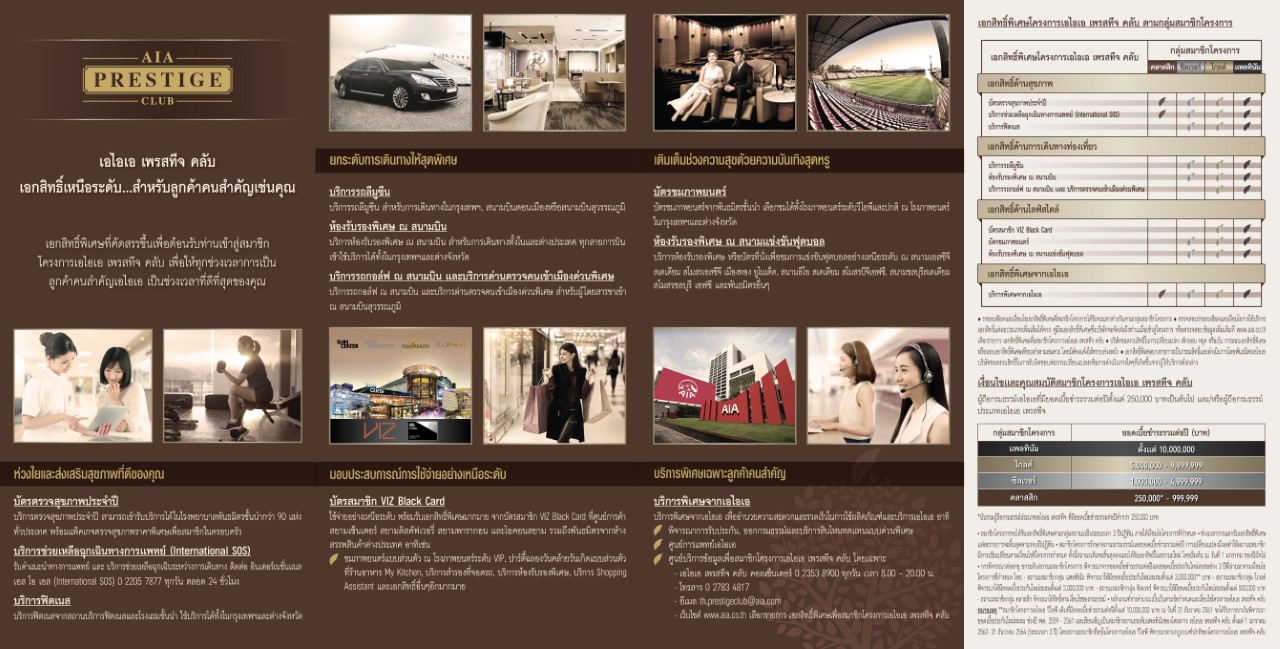 สำหรับผู้ที่สนใจโครงการเอไอเอ เพรสทีจ คลับสามารถศึกษาข้อมูลเพิ่มเติมได้ที่ campaigns.aia.co.th/prestigeclubหรือติดต่อตัวแทนประกันชีวิตเอไอเอ หรือ AIA Call Center โทร 1581