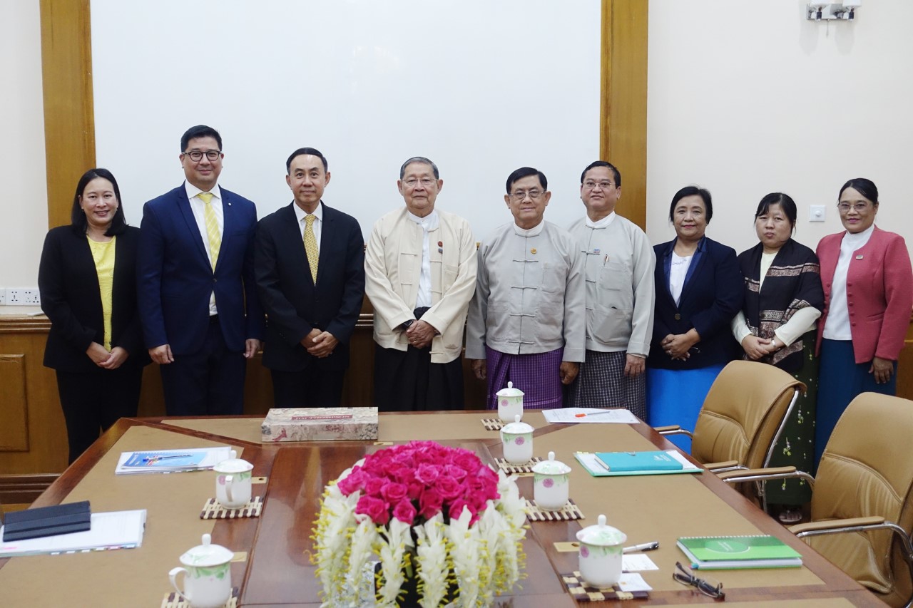 นายพิศิษฐ์ เสรีวิวัฒนา(ที่ 3 จากซ้าย) กรรมการผู้จัดการ ธนาคารเพื่อการส่งออกและนำเข้าแห่งประเทศไทย (EXIM BANK) เข้าเยี่ยมคารวะนายซอ วิน (ที่ 4 จากซ้าย) รัฐมนตรีว่าการกระทรวงวางแผนและการคลังเมียนมา เพื่อหารือแนวทางความร่วมมือเพื่อสนับสนุนทางการเงินให้แก่ผู้ประกอบการไทยเพื่อส่งเสริมการค้าการลงทุนไทย-เมียนมา โดยเฉพาะโครงการภายใต้แผนพัฒนาเมียนมาอย่างยั่งยืน (Myanmar Sustainable Development Plan : MSDP) การสนับสนุนการใช้เงินสกุลท้องถิ่นในการทำการค้า รวมถึงความคืบหน้าโครงการออกพันธบัตรรัฐบาลเมียนมาในประเทศไทย ณ กรุงเนปิดอว์ เมียนมา เมื่อเร็วๆนี้