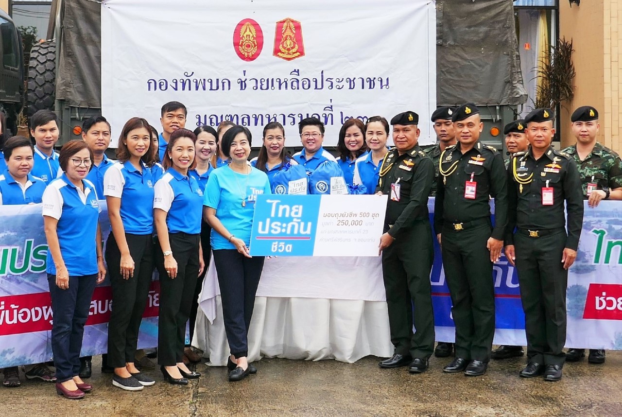 พันเอก สุจิรชัย มหาธรรม รองเสนาธิการมณฑลทหารบกที่ 23 รับมอบถุงยังชีพ จำนวน 500 ถุง จากนางสาวปาณี เจียรดิฐ ผู้ช่วยผู้อำนวยการสายงาน สายงานส่งเสริมกิจกรรมองค์กรเพื่อสังคม บริษัท ไทยประกันชีวิต จำกัด(มหาชน)เพื่อนำไปช่วยเหลือผู้ประสบอุทกภัยจากพายุโซนร้อน “โพดุล” ในเขตพื้นที่จังหวัดขอนแก่น กาฬสินธุ์และร้อยเอ็ด ณ มณฑลทหารบกที่ 23 ค่ายศรีพัชรินทร จ.ขอนแก่น