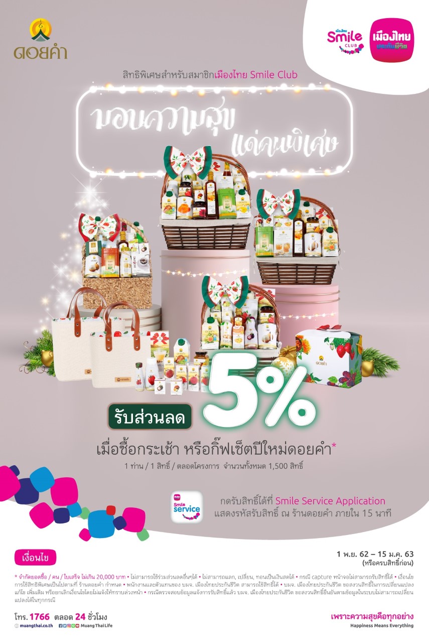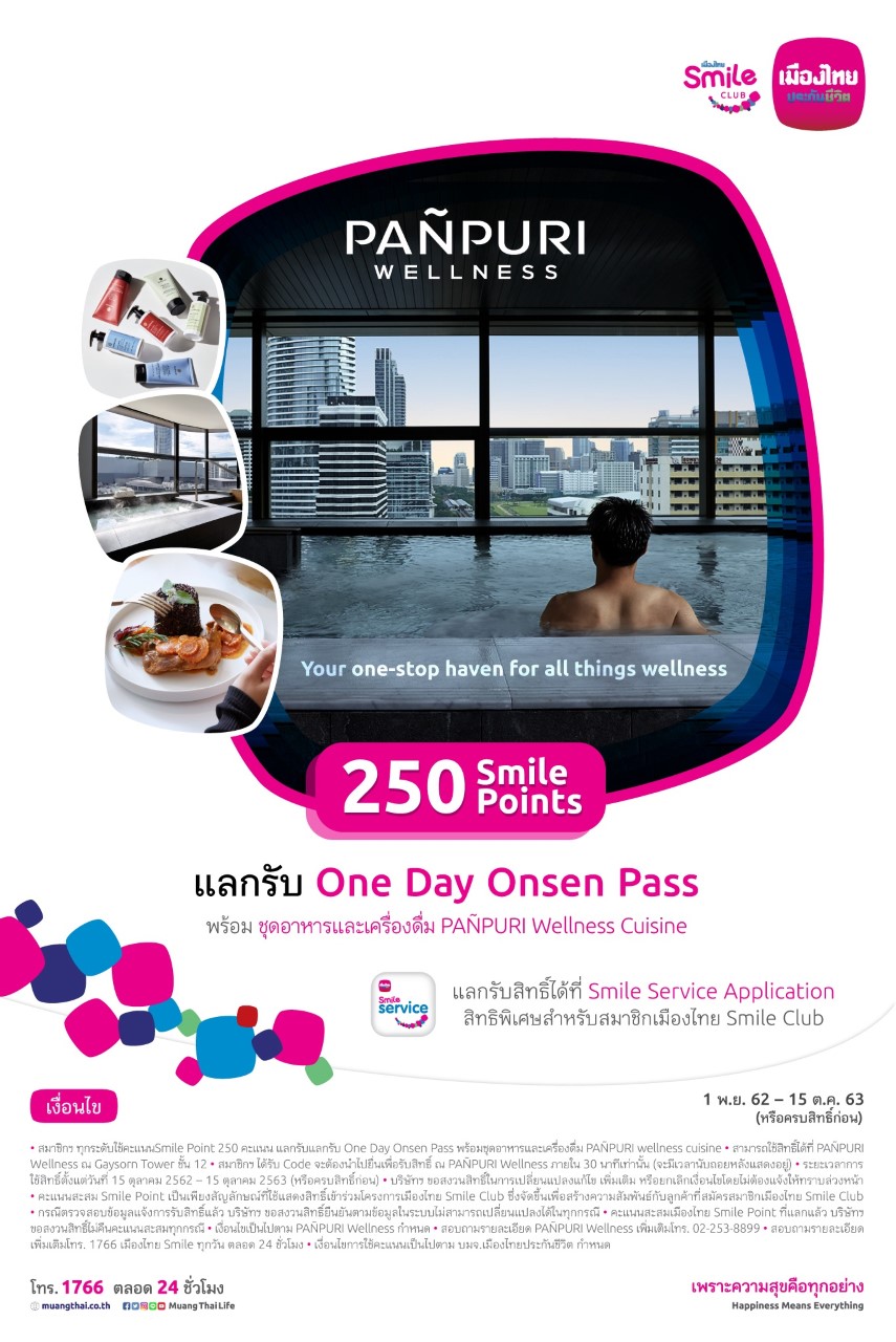 ทั้งนี้เพื่อสะท้อนประสบการณ์การดูแลสุขภาพที่ลูกค้าสัมผัสได้จริงและแสดงถึงความมุ่งมั่นในการมอบสิทธิประโยชน์ มากมาย เพียงคุณเป็นสมาชิกฯ ก็สามารถใช้คะแนนสะสม Smile Point แลกเข้าร่วมกิจกรรม แลกรับส่วนลด แลกรับสินค้า หรือแลกรับบริการพิเศษ ล่าสุด! เมืองไทย Smile Club ได้เดินหน้าสร้างสรรค์กิจกรรม Onsen Panpuri Wellness ให้สมาชิกฯ ผู้รักสุขภาพใช้คะแนนสะสม Smile Point แลกรับ One Day Onsen Pass พร้อมชุดอาหารและเครื่องดื่ม Panpuri wellness cuisine และกิจกรรม Smile Healthy Redemption ร้านยากรุงเทพ เพียงใช้คะแนนสะสม Smile Point เพื่อรับสิทธิพิเศษ ณ ร้านยากรุงเทพ รวมถึงกิจกรรม กระเช้าดอยคำ มอบความสุขแด่คนพิเศษ รับส่วนลด 5% เมื่อซื้อกระเช้า หรือกิ๊ฟเซ็ตปีใหม่ดอยคำ เพื่อมอบเป็นของขวัญรับปี 2563 สามารถดูรายละเอียดกิจกรรมและสิทธิประโยชน์ต่างๆ เพิ่มเติมได้ที่ www.muangthai.co.th
