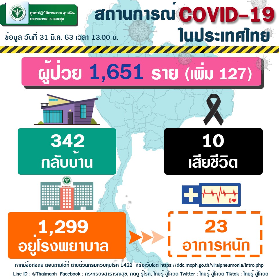บ่ายวันนี้ (31 มีนาคม 2563)ที่กระทรวงสาธารณสุข จ.นนทบุรี นายแพทย์สุขุม กาญจนพิมาย ปลัดกระทรวงสาธารณสุขและคณะ แถลงข่าวสถานการณ์โรคติดเชื้อไวรัสโคโรนา 2019 (โควิด-19) ว่า วันนี้ มีผู้ป่วยกลับบ้านได้ 342 ราย ยังรักษาในโรงพยาบาล 1,299 ราย เสียชีวิต 10 ราย ผู้ป่วยสะสม 1,651 ราย สำหรับทั่วโลกมีรายงานผู้ป่วยใน 198 ประเทศ 2 เขตบริหารพิเศษ 2 เรือสำราญ พบผู้ป่วย 768,466 ราย เสียชีวิต 36,914 ราย ส่งผลให้ความต้องการใช้ยา อุปกรณ์ เวชภัณฑ์ทางการแพทย์ในการดูแลรักษาผู้ป่วยเพิ่มขึ้นทั่วโลก โดยเฉพาะหน้ากาก N95 และชุดป้องกันร่างกาย (PPE.) ซึ่งผู้ผลิตรายใหญ่อยู่ในต่างประเทศ ไทยต้องสั่งซื้อเข้ามา เมื่อเกิดการระบาดของโรคการสั่งซื้อทำได้ยากขึ้น ต้องใช้ระยะเวลานานขึ้นกว่าเดิม