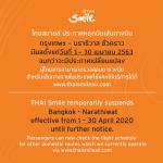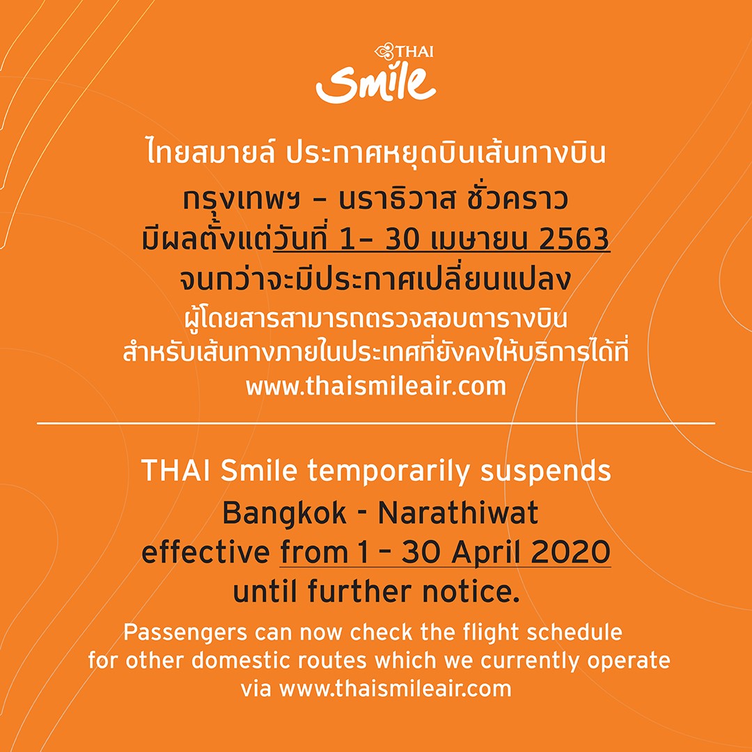 สายการบินไทยสมายล์ประกาศหยุดบินเส้นทางบินไป-กลับ กรุงเทพฯ -นราธิวาส เป็นการชั่วคราว เส้นทางบินกรุงเทพ- นราธิวาส มีผลตั้งแต่วันที่ 1 – 30 เมษายน 2563 จนกว่าจะมีประกาศเปลี่ยนแปลง โดยเส้นทางภายในประเทศที่ยังคงให้บริการปกติ ได้แก่ เชียงใหม่ เชียงราย อุบลราชธานี อุดรธานี ขอนแก่น กระบี่ สุราษฎ์ธานี ภูเก็ต และหาดใหญ่ สำหรับผู้โดยสารที่ได้รับผลกระทบจากการยกเลิกเที่ยวบินในวันดังกล่าว สายการบินไทยสมายล์ได้อำนวยความสะดวกดังนี้