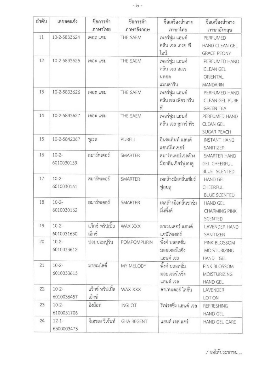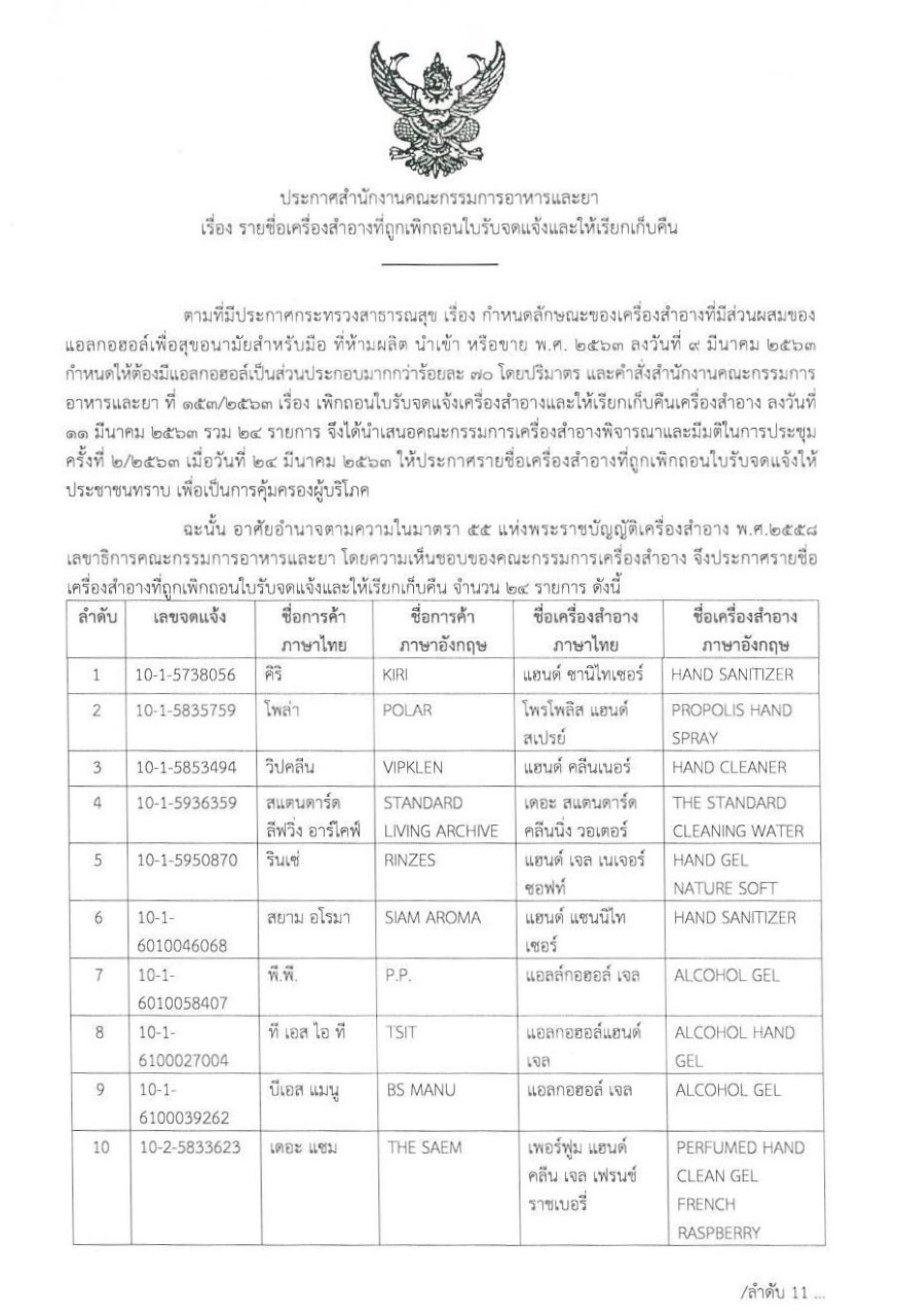 ประกาศคณะกรรมการอาหารและยา รายชื่อ “เจลล้างมือ” ที่ถูกเรียกเก็บคืน เพราะไม่ได้มาตรฐาน 24 รายการ