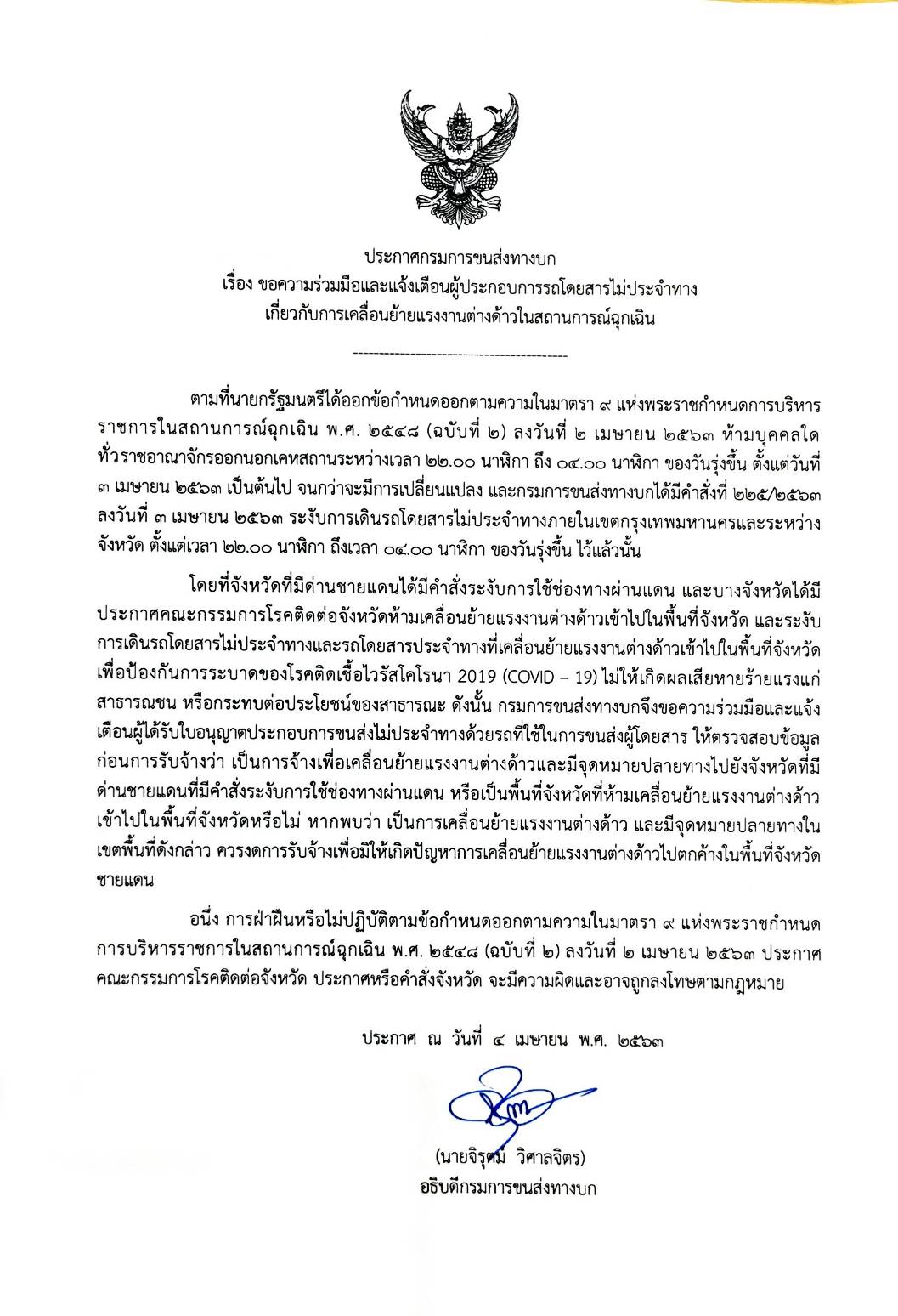นายจิรุตม์ วิศาลจิตร อธิบดีกรมการขนส่งทางบก เปิดเผยว่า เนื่องจากสถานการณ์ปัจจุบัน พบว่าบางจังหวัดที่มีด่านชายแดนได้มีคำสั่งระงับการใช้ช่องทางผ่านแดน และบางจังหวัดได้มีประกาศคณะกรรมการโรคติดต่อจังหวัด ห้ามเคลื่อนย้ายแรงงานต่างด้าวเข้าไปในพื้นที่จังหวัด และระงับการเดินรถโดยสารไม่ประจำทางและรถโดยสารประจำทางที่เคลื่อนย้ายแรงงานต่างด้าวเข้าไปในพื้นที่จังหวัด