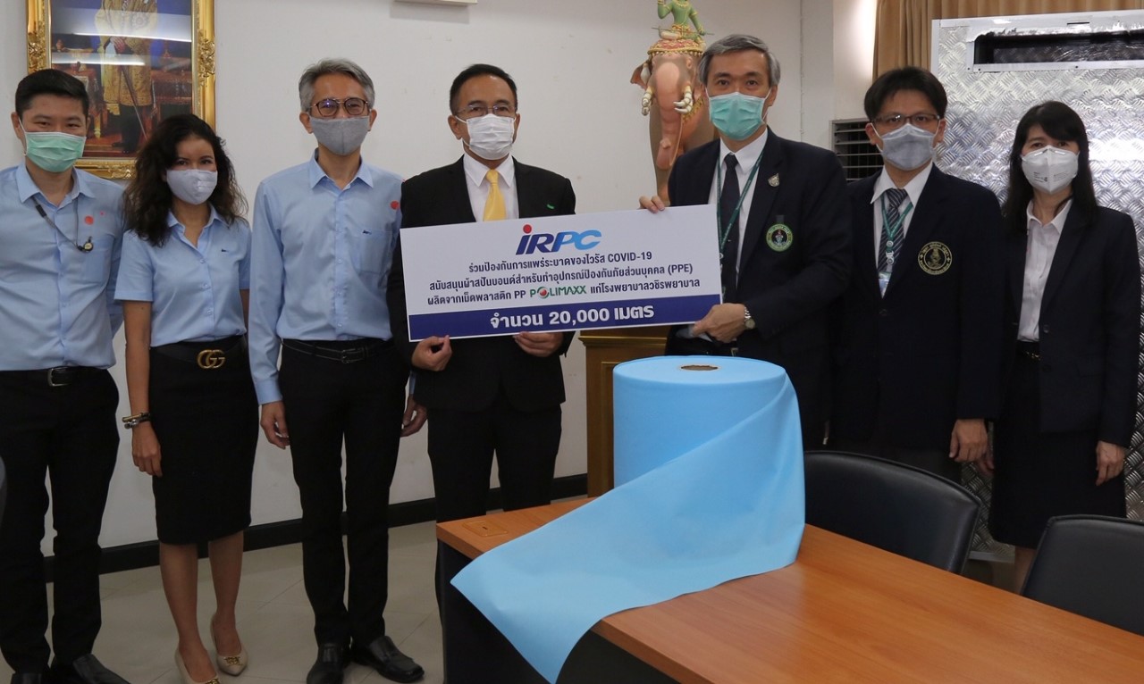 IRPC เล็งเห็นถึงความสำคัญในการทุ่มเทเสียสละของบุคลากรทางการแพทย์ ตลอดจนทุกหน่วยงานเกี่ยวข้องในการปฎิบัติหน้าที่เพื่อส่วนรวม จึงร่วมมือกับลูกค้าของบริษัทฯ ที่ซึ่งเป็นโรงงานผลิตผ้าสปันบอนด์ ผลิตจากเม็ดพลาสติก PP เกรดพิเศษ มอบให้กับมหาวิทยาลัยนวมินทราธิราช โดยคณะแพทยศาสตร์วชิรพยาบาล นำไปผลิตเป็นชุด PPE ใช้ในโรงพยาบาลวชิรพยาบาลและส่งมอบให้กับโรงพยาบาลเครือข่าย