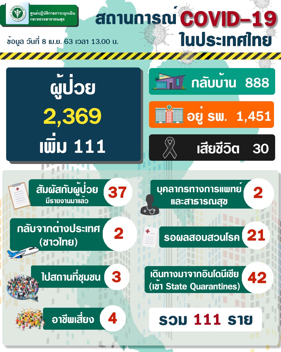 2. สถานการณ์ในประเทศไทย (7 เมษายน 2563 เวลา 16.00 น.) ผู้ป่วยกลับบ้านได้ 64 ราย ผู้ป่วยรายใหม่ 111 ราย นับเป็นลำดับที่ 2,259-2,369 จำแนกเป็นกลุ่มดังนี้