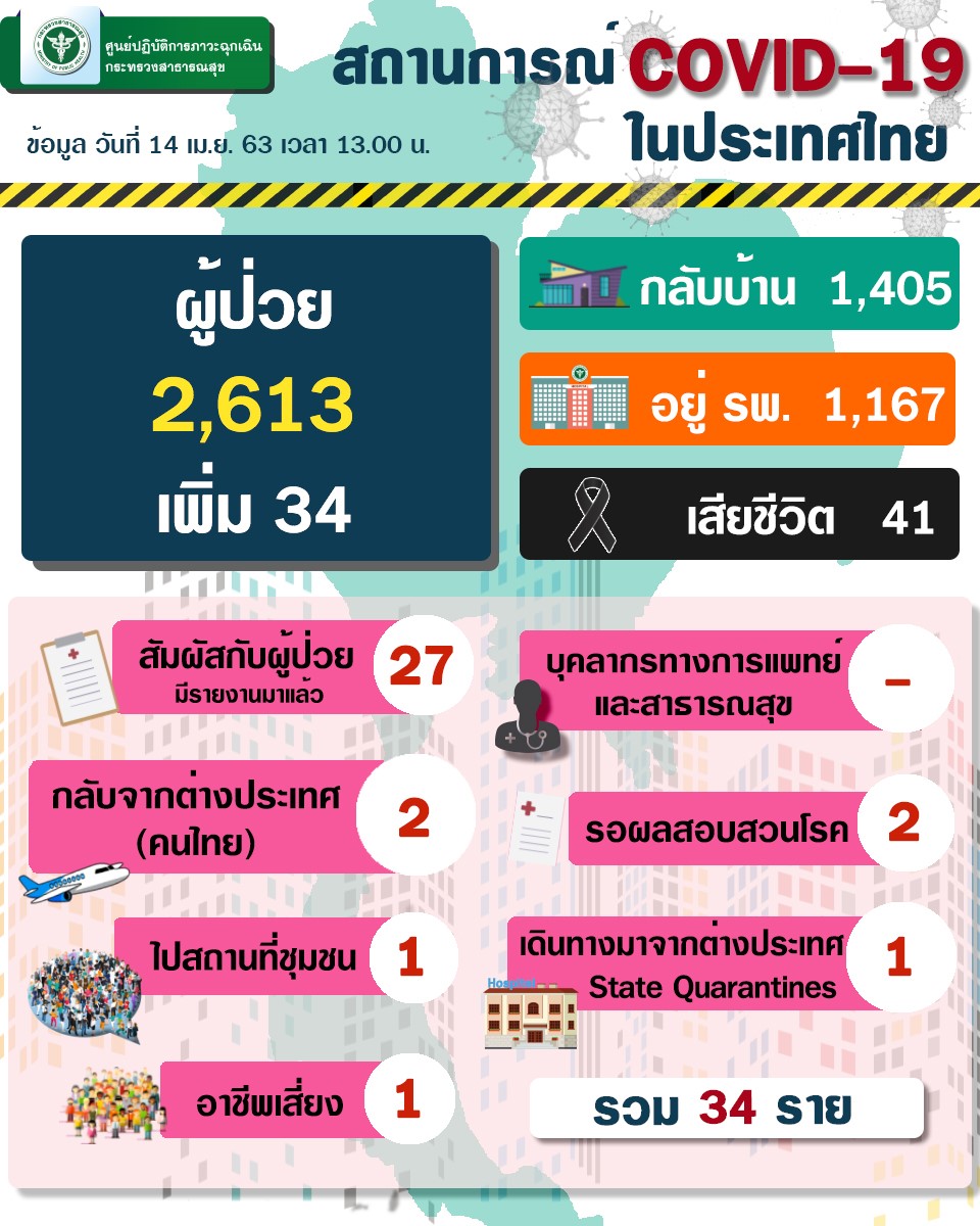 2. สถานการณ์ในประเทศไทย (13 เมษายน 2563 เวลา 16.00 น.) ผู้ป่วยกลับบ้านได้ 117 ราย ผู้ป่วยรายใหม่ 34 ราย นับเป็นลำดับที่ 2,580-2,613 จำแนกเป็นกลุ่มดังนี้