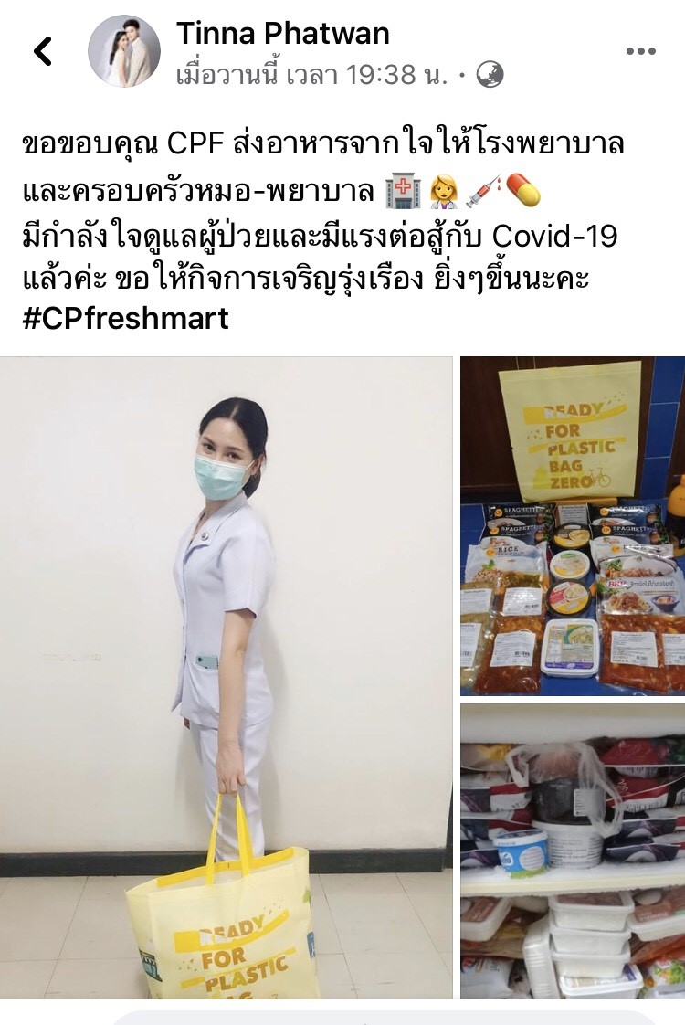 ขณะที่ เฟซบุ๊ค ของ Chonthicha Kakammay โพสต์ว่า ทำดี ได้ (กิน) ดี บริษัท CP แจกจริง ต้านภัยโควิด เป็นกำลังให้กับพยาบาล ที่ปฏิบัติหน้าที่ในการนี้ ขอให้กิจการของท่านเจริญยิ่งๆ ขึ้นไป # ครอบครัวพยาบาล พร้อมถ่ายรูปสมาชิกในครอบครัวพร้อมอาหารที่ตื่นเต้นกับอาหารที่ได้รับ