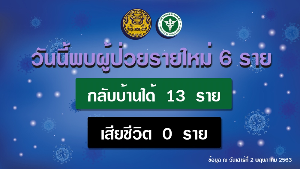 สรุปภาพรวมวันนี้มีผู้ป่วยรายใหม่ 6 ราย กลับบ้านวันนี้ 13 ราย รวมสะสม 2,732 ราย ยังรักษาอยู่ในโรงพยาบาล 180 ราย ผู้เสียชีวิตรวม 54 ราย ทำให้มีผู้ป่วยสะสมทั้งสิ้น 2,966 ราย