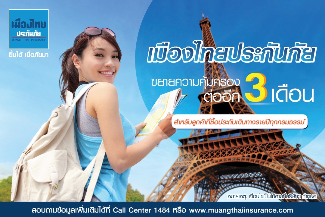 สำหรับลูกค้าที่ถือกรมธรรม์ประกันเดินทางต่างประเทศแบบรายปี เมืองไทยประกันภัยขยายระยะเวลาความคุ้มครองให้อัตโนมัติ 3 เดือน นับจากวันที่สิ้นสุดความคุ้มครองเดิม โดยไม่คิดค่าเบี้ยประกันเพิ่มเติม สำหรับลูกค้าที่กรมธรรม์ยังมีผลคุ้มครองระหว่างวันที่ 30 เมษายน 2562 ถึง 30 เมษายน 2563 โดยรายละเอียดความคุ้มครองและบริการช่วยเหลือต่าง ๆ ยังคงเดิมทุกประการ โดยลูกค้าไม่ต้องดำเนินการแจ้งความประสงค์ เมืองไทยประกันภัยจะแจ้งให้ท่านทราบโดย SMS / E-mail หรือตามที่อยู่บนกรมธรรม์
