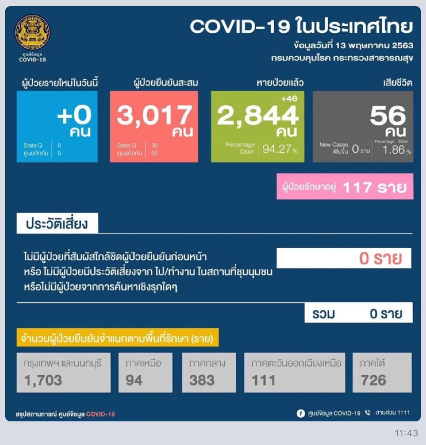 นายแพทย์ทวีศิลป์ วิษณุโยธิน โฆษกศูนย์บริหารสถานการณ์โควิด-19 (ศบค.) เปิดเผยว่า สถานการณ์ผู้ป่วยโรคโควิด-19ในวันนี้ (13 พ.ค.) พบว่า วันนี้เป็นวันแรกที่ไม่พบผู้ติดเชื้อเพิ่ม ทำให้ยอดสะสมอยู่ที่ 3,017 คน รักษาหายแล้ว 2,844 คน และไม่มีผู้เสียชีวิต ส่งผลให้ยอดผู้เสียชีวิตสะสมอยู่ที่ 56 คน