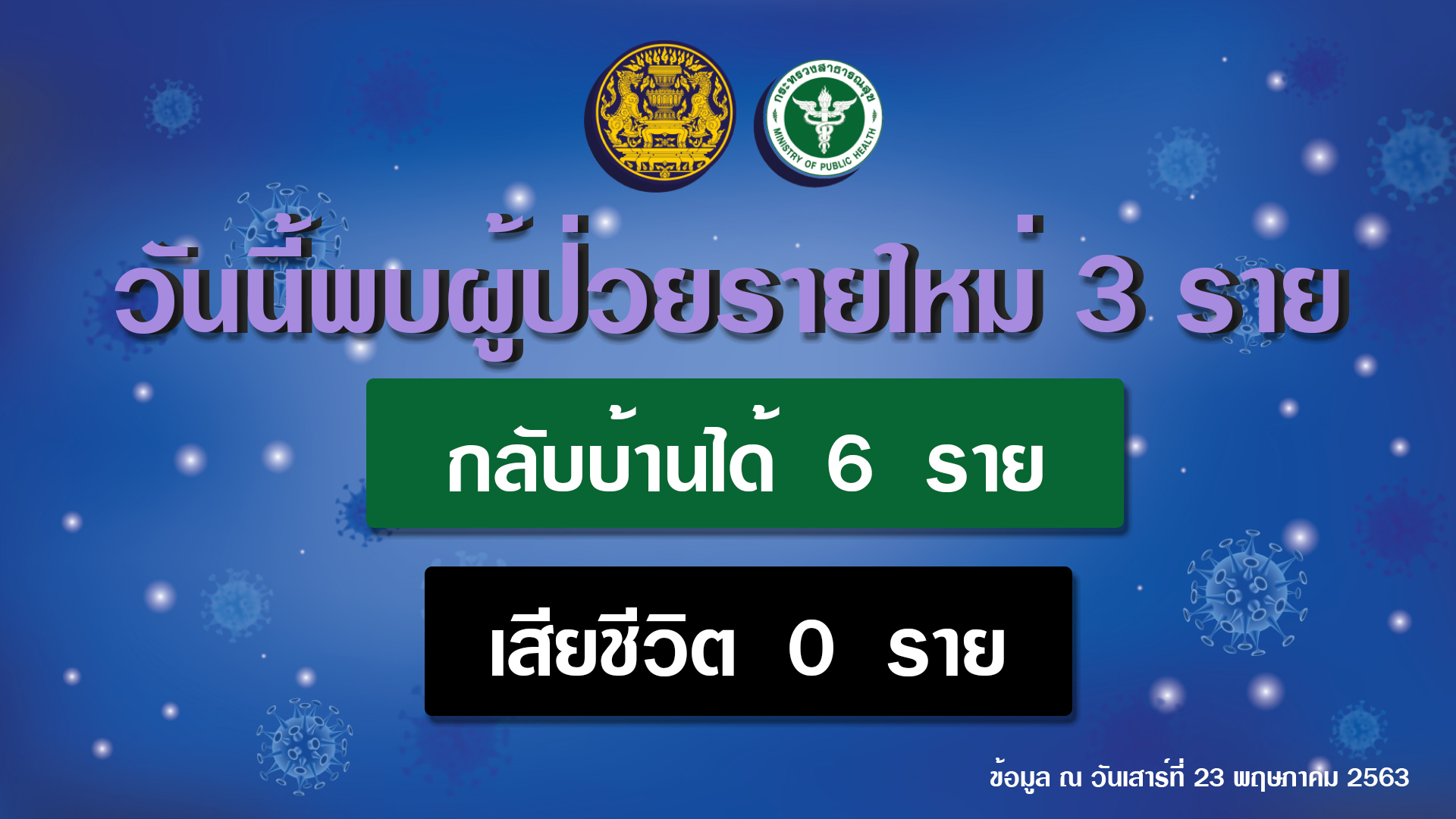 68 ราย หรือคิดเป็นร้อยละ 2.23 ของผู้ป่วยทั้งหมด ไม่มีผู้เสียชีวิตเพิ่ม ผู้เสียชีวิตสะสม 56 ราย รวมผู้ป่วยสะสม 3,040 ราย มีผู้ติดเชื้อรายใหม่ 3 ราย เป็นผู้ป่วยที่พบในชุมชนและอยู่ในสถานกักตัวที่รัฐจัดให้ (State Quarantine)