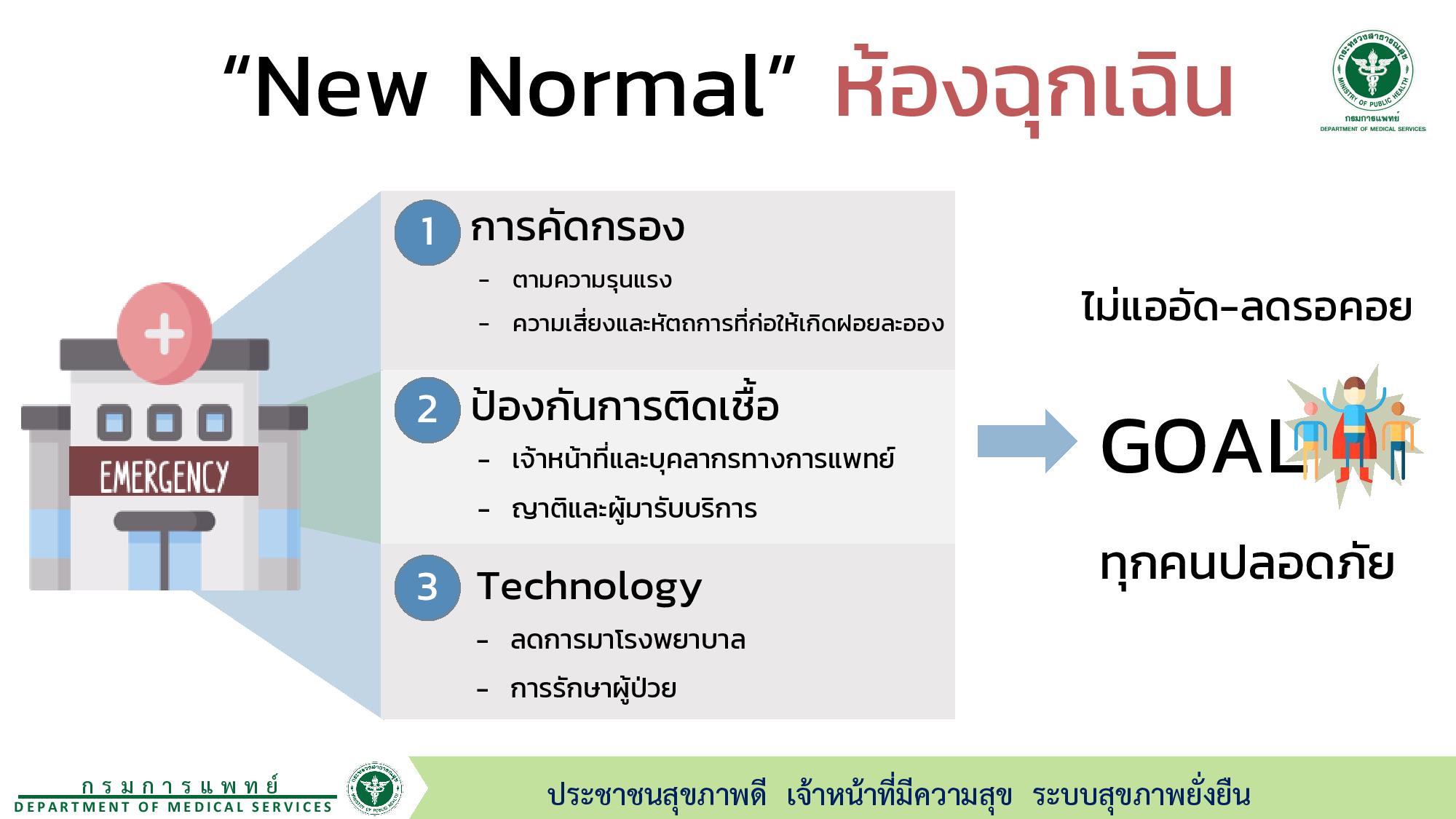 กระทรวงสาธารณสุข วางแนวทางให้บริการการแพทย์ฉุกเฉินตามแบบปกติวิถีใหม่ (New Normal) เน้นควบคุมการแพร่กระจายเชื้อโควิด 19 ปรับระบบขั้นตอนการให้บริการ ใส่ชุดป้องกันการติดเชื้อลดความเสี่ยงขณะให้บริการในห้องฉุกเฉิน พร้อมนำเทคโนโลยีมาใช้งานคัดกรองประเมินอาการผู้ป่วย ให้คำปรึกษา ส่งยาถึงบ้าน ด้านทีมแพทย์ฉุกเฉินและบุคลากรปรับตัว ฝึกอบรมให้เชี่ยวชาญ การช่วยชีวิตเพื่อลดความเสี่ยงการช่วยเหลือผู้ป่วยฉุกเฉินแต่ละครั้ง