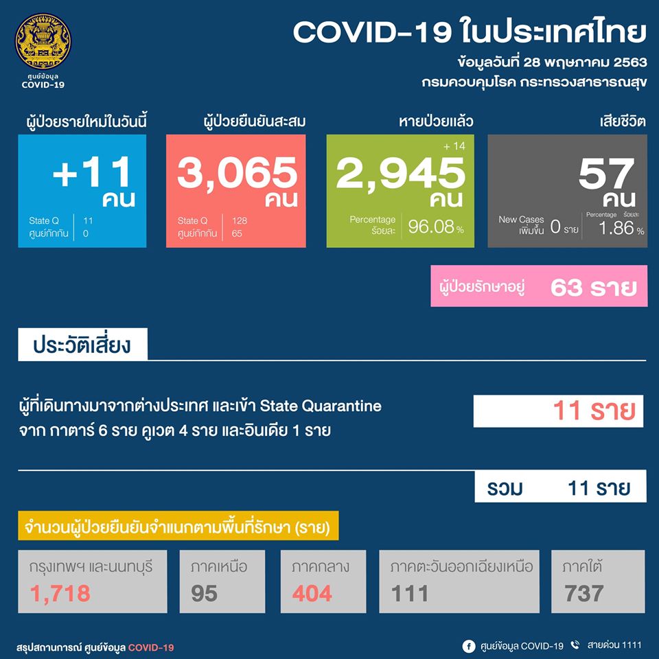 นายแพทย์ทวีศิลป์ วิษณุโยธิน โฆษกศูนย์บริหารสถานการณ์โควิด-19 (ศบค.) เปิดเผยว่า สถานการณ์ผู้ป่วยโรคโควิด-19ในวันนี้ (28 พ.ค.63) พบว่า มีผู้ป่วยติดเชื้อ 11 คน ทำให้ยอดสะสมอยู่ที่ 3,065 คน รักษาหายเพิ่ม 14 คน สะสม 2,945 คน และไม่มีผู้เสียชีวิต ทำให้ยอดสะสมอยู่ที่ 57 คน สำหรับผู้ป่วยที่อยู่ระหว่างการรักษาอยู่ที่ 63 คน