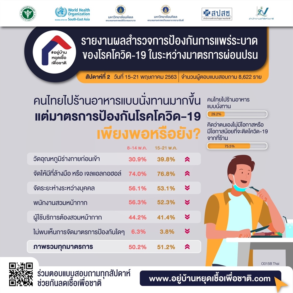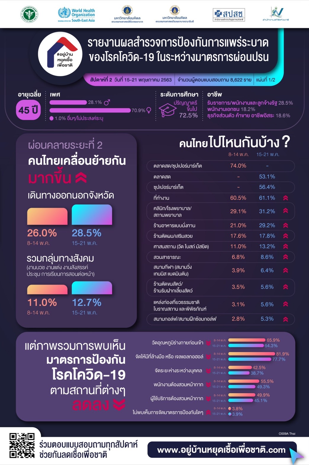 กระทรวงสาธารณสุข โดยสำนักงานพัฒนานโยบายสุขภาพระหว่างประเทศ ร่วมกับองค์การอนามัยโลกสำนักงานภูมิภาคเอเชียตะวันออกเฉียงใต้ คณะแพทยศาสตร์ศิริราชพยาบาล คณะแพทยศาสตร์โรงพยาบาลรามาธิบดี สำนักงานหลักประกันสุขภาพแห่งชาติ และสำนักงานสถิติแห่งชาติ ทำการสำรวจผลการป้องกันการแพร่ระบาดของโรคโควิด-19 หลังผ่อนปรนมาตรการล็อกดาวน์สัปดาห์ที่ 2 ระหว่างวันที่ 15-21 พ.ค. 2563 โดยมีผู้ตอบแบบสำรวจ 8,622 ราย พบว่า คนไทยมีการปฏิบัติตัวเพื่อป้องกันโควิด-19 น้อยลงอย่างต่อเนื่อง