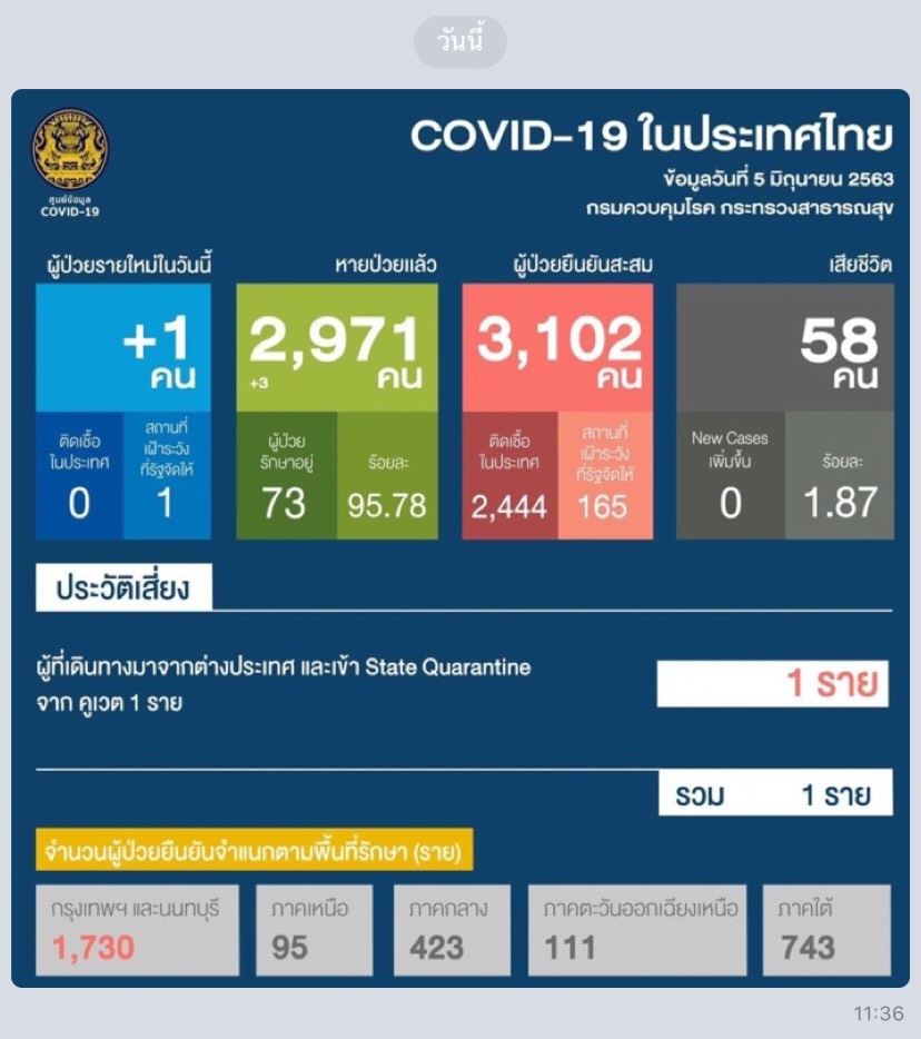 สำหรับผู้ป่วยใหม่ เป็นชายไทยอายุ 45 ปี เดินทางมาจากคูเวต และเข้า State Quarantine อาชีพรับจ้างทำงานแคมป์ของโรงงาน กลับไทยเมื่อ 24 พ.ค. 63และเข้า State Quarantine ที่ กทม. ตรวจครั้งที่ 1 เมื่อ 26 พ.ค.ไม่พบเชื้อ ตรวจครั้งที่ 2 วันที่ 3 มิ.ย.63 พบเชื้อแต่ไม่มีอาการ