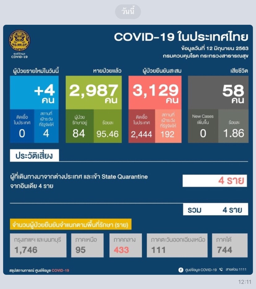 นายแพทย์ทวีศิลป์ วิษณุโยธิน โฆษกศูนย์บริหารสถานการณ์โควิด-19 (ศบค.) เปิดเผยว่า สถานการณ์ผู้ป่วยโรคโควิด-19ในวันนี้ (12 มิ.ย.63) พบว่า มีผู้ป่วยติดเชื้อ 4 คน ทำให้ยอดสะสมอยู่ที่ 3,129 คน รักษาหาย สะสม 2,987 คน และไม่มีผู้เสียชีวิต สะสมอยู่ที่ 58 คน มีผู้ป่วยที่อยู่ระหว่างการรักษาอยู่ที่ 84 คน