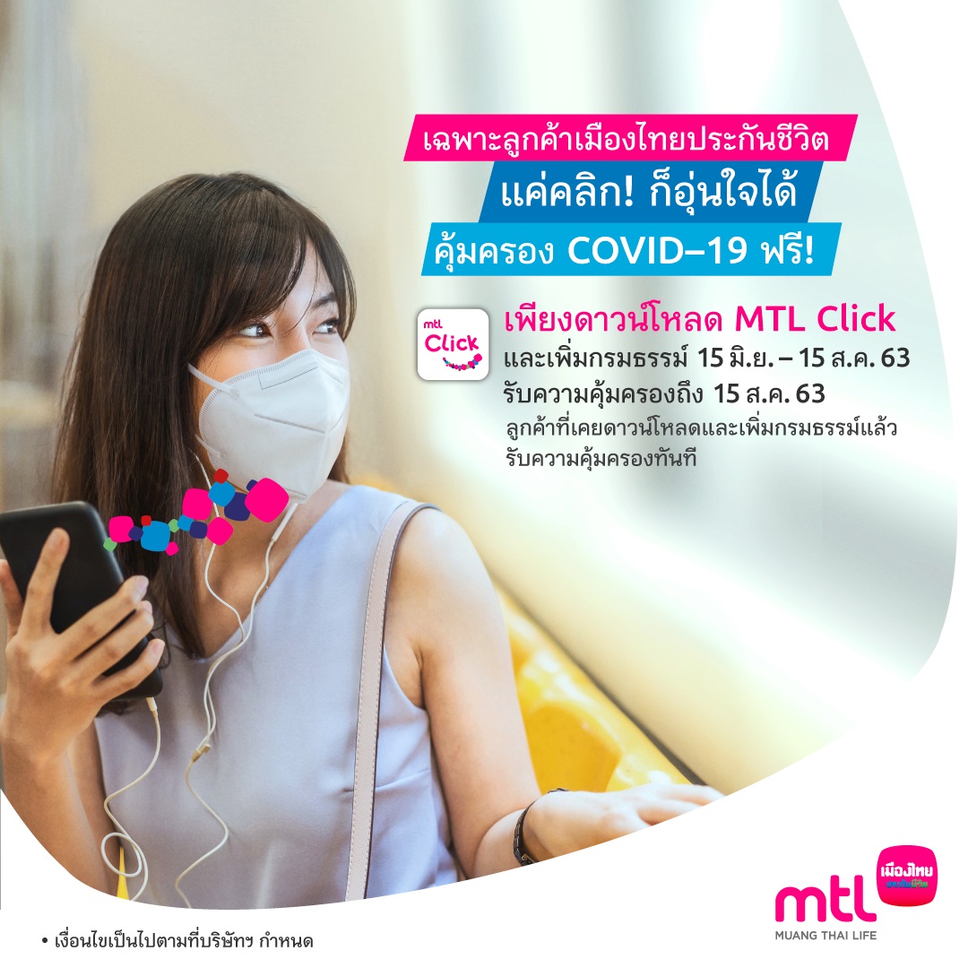 นายสาระ ล่ำซำ กรรมการผู้จัดการและประธานเจ้าหน้าที่บริหาร บริษัท เมืองไทยประกันชีวิต จำกัด (มหาชน) เปิดเผยว่า ปัจจุบันสถานการณ์การแพร่ระบาดของโรคติดเชื้อไวรัสโคโรนา 2019 (COVID-19) จะเริ่มมีสัญญาณคลี่คลายไปในทิศทางที่ดีขึ้น แต่รูปแบบของการใช้วิถีชีวิตยังคงต้องไม่ประมาท การ์ดไม่ตก เพื่อให้ทุกคนผ่านพ้นวิกฤตนี้ไปได้ปลอดภัย ทั้งนี้เพื่อเป็นการมอบความห่วงใยและความอุ่นใจให้กับลูกค้าของเมืองไทยประกันชีวิตอย่างต่อเนื่อง บริษัทฯ จึงได้มอบความคุ้มครอง COVID-19 ฟรี! ให้แก่ลูกค้าใหม่ที่มีกรมธรรม์ประกันรายบุคคลหรือประกันกลุ่ม ที่กรมธรรม์ยังมีผลความคุ้มครอง และอายุผู้เอาประกันภัยไม่เกิน 70 ปี เพียงดาวน์โหลด แอปพลิเคชัน “MTL Click” พร้อมลงทะเบียนและเพิ่มกรมธรรม์ที่มีอยู่แล้วให้เสร็จสมบูรณ์ จะได้รับสิทธิความคุ้มครอง ตั้งแต่วันที่ 15 มิถุนายน 2563 หรือวันที่ลูกค้าดาวน์โหลดและเพิ่มกรมธรรม์ในแอปพลิเคชัน MTL Click (แล้วแต่เหตุการณ์ใดเกิดขึ้นหลังสุด) และความความคุ้มครองจะสิ้นสุด ณ วันที่ 15 สิงหาคม 2563