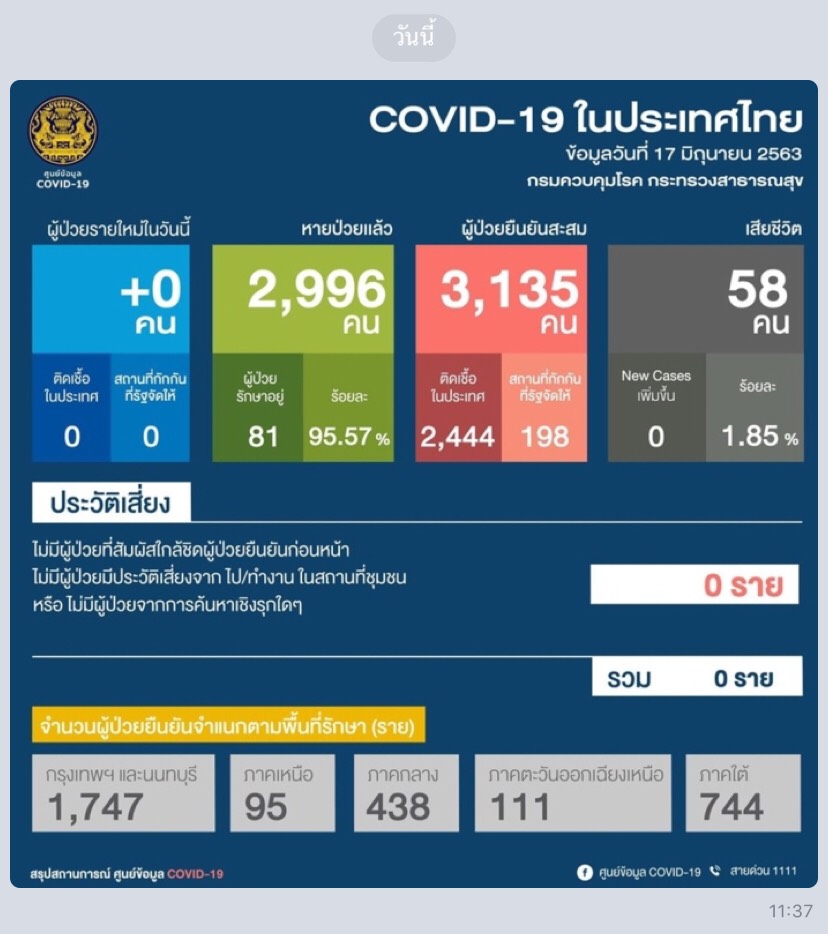 นายแพทย์ทวีศิลป์ วิษณุโยธิน โฆษกศูนย์บริหารสถานการณ์โควิด-19 (ศบค.) เปิดเผยว่า สถานการณ์ผู้ป่วยโรคโควิด-19ในวันนี้ (17 มิ.ย.63) ไม่พบผู้ป่วยติดเชื้อรายใหม่ทั้งจากในประเทศ และผู้เดินทางกลับจากต่างประเทศ ทำให้ยอดติดเชื้อสะสมอยู่ที่ 3,135 คน รักษาหายเพิ่ม 3 คน รวมรักษาหายแล้ว 2,996 คน และไม่มีผู้เสียชีวิต สะสมอยู่ที่ 58 คน มีผุ้ป่วยที่อยู่ระหว่างการรักษา 81 คน