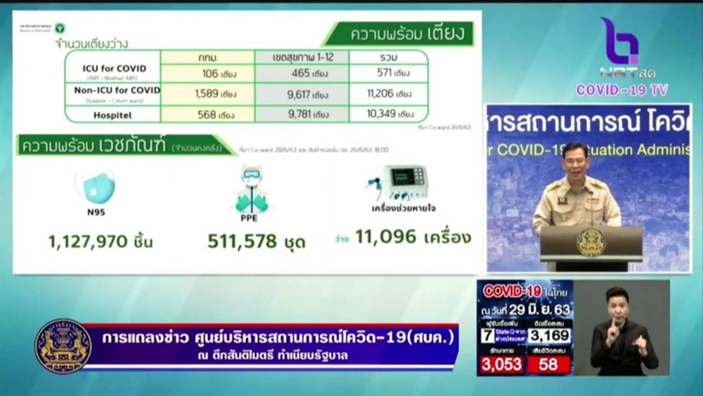 วันนี้ (29 มิถุนายน 2563) ที่ศูนย์บริหารสถานการณ์การแพร่ระบาดของโรคติดเชื้อไวรัสโคโรนา 2019 (โควิด 19) นายแพทย์สุขุม กาญจนพิมาย ปลัดกระทรวงสาธารณสุข(สธ.) แถลงข่าวสถานการณ์โรคโควิด 19 ว่า เป็นเรื่องน่ายินดีที่ไม่มีรายงานพบผู้ติดเชื้อภายในประเทศไทยติดต่อกันถึง 35 วันแล้ว พบผู้ป่วยรายสุดท้ายในประเทศเมื่อวันที่ 25 พ.ค.63 ขณะนี้สามารถควบคุมสถานการณ์ได้ดี จำนวนผู้ป่วยใหม่ลดลง ล่าสุดในวันนี้ พบผู้ติดเชื้อรายใหม่ 7 ราย เป็นคนไทยที่เดินทางมาจากต่างประเทศ โดยเข้าสถานกักกันที่รัฐจัดให้ (State Quarantine) ไม่มีรายงานผู้เสียชีวิตเพิ่ม ปัจจุบันมีผู้ป่วยสะสม 3,169 ราย หายกลับบ้านรวม 3,053 ราย เสียชีวิตรวม 58 ราย ยังรักษาใน รพ. 58 ราย ไม่มีผู้ป่วยอาการหนักหรือต้องใช้เครื่องช่วยหายใจ