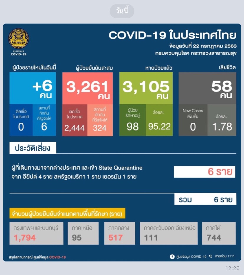 นายแพทย์ทวีศิลป์ วิษณุโยธิน โฆษกศูนย์บริหารสถานการณ์การแพร่ระบาดของโรคติดเชื้อไวรัสโคโรน่า 2019 (ศบค.) แถลงสถานการณ์แพร่ระบาดของโรคโควิด-19 ประจำวัน ว่า ประเทศไทยพบจำนวน ผู้ติดเชื้อรายใหม่เพิ่ม 6 ราย จากใน State Quarantine ยอดผู้ป่วยสะสม 3,261 ราย ไม่พบผู้เสียชีวิตเพิ่ม รวมยอดผู้เสียชีวิต 58 ราย ผู้ป่วยที่รักษาหายแล้ว 3,105 ราย ยังคงรักษาตัวอยู่ในโรงพยาบาล 98 ราย ผู้ป่วยใหม่ 6 ราย เดินทางมาจากอียิปต์ 4 ราย สหรัฐฯ 1 ราย และเยอรมนี 1 ราย