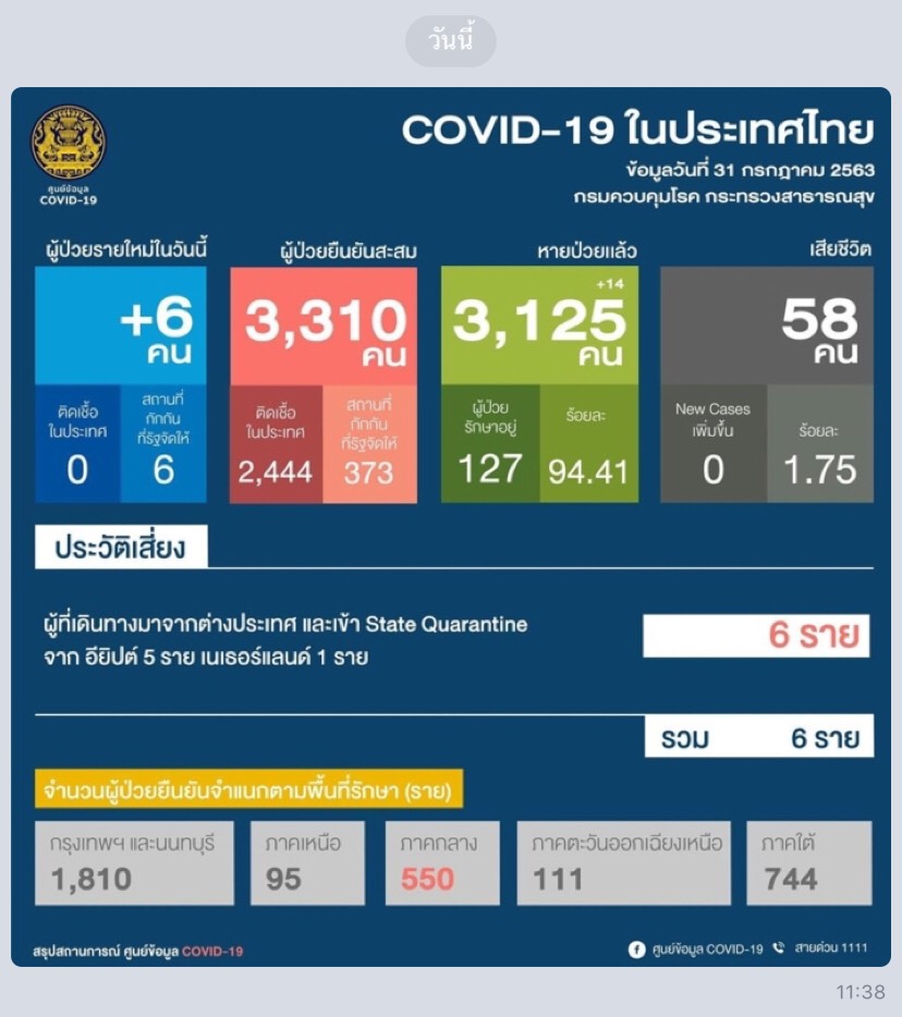 นายแพทย์ทวีศิลป์ วิษณุโยธิน โฆษกศูนย์บริหารสถานการณ์โควิด-19 (ศบค.) เปิดเผยว่า สถานการณ์ผู้ป่วยโรคโควิด-19 ในวันนี้ (31 ก.ค.63) พบผู้ติดเชื้อรายใหม่ 6 คน เดินทางกลับจากต่างประเทศ ทำให้ยอดติดเชื้อสะสมอยู่ที่ 3,310 คน หายป่วยสะสม 3,125 คน ไม่มีเสียชีวิตเพิ่มคงที่ 58 คน อยู่ระหว่างการรักษา 127 คน