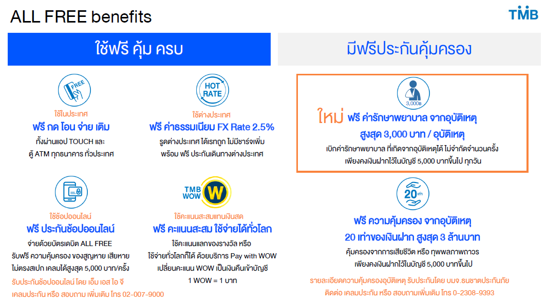 โดยทีเอ็มบียังคงตอกย้ำและเพิ่มเติมความคุ้มค่ามากขึ้นไปอีก ด้วยการส่งมอบผลิตภัณฑ์และบริการที่เหนือความคาดหมาย คือ “ประกันฟรี ใครๆ ก็มีได้” แค่มีบัญชีออลล์ฟรี ก็ได้รับประกันคุ้มครองฟรีโดยไม่มีค่าใช้จ่าย ด้วยการคงเงินฝากไว้ 5,000 บาทขึ้นไปทุกวัน จะได้รับฟรี ค่ารักษาพยาบาลจากอุบัติเหตุ เบิกค่ารักษาพยาบาลจากอุบัติเหตุได้สูงสุด 3,000 บาทต่ออุบัติเหตุ ไม่จำกัดครั้ง และไม่ตัดสิทธิ์หากลูกค้าต้องการใช้ประกันแหล่งอื่นด้วย โดยสามารถใช้สิทธิ์จากบัญชีเพื่อใช้ ออลล์ฟรี เพิ่มเติมร่วมกันได้ ยิ่งกว่านั้นในกรณีเสียชีวิตหรือทุพพลภาพถาวรจากอุบัติเหตุ ลูกค้ายังคงได้รับฟรีประกันอุบัติเหตุ 20 เท่าของเงินฝากสูงสุดถึง 3 ล้านบาท โดยจะพิจารณาความคุ้มครองและคำนวณจากยอดเงินคงเหลือในเดือนก่อนหน้าเสียชีวิต นับเป็นการสร้างปรากฏการณ์ใหม่ให้ลูกค้าบัญชีเงินฝากได้รับสิทธิประโยชน์ด้านประกันพ่วงมาด้วยแบบฟรีๆ