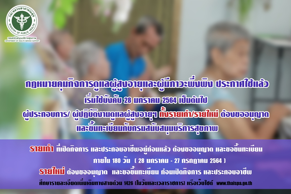 นายแพทย์ธเรศ กรัษนัยรวิวงค์ อธิบดีกรมสนับสนุนบริการสุขภาพ(กรม สบส.)กระทรวงสาธารณสุข เปิดเผยว่า ขณะนี้กฎหมายลูกที่ออกตามพระราชบัญญัติ (พ.ร.บ.)สถานประกอบการเพื่อสุขภาพ พ.ศ.2559 มาตรา 3(3) ได้ประกาศลงในราชกิจจานุเบกษาแล้ว เมื่อวันที่ 31 ก.ค.63 มีผลบังคับใช้ภายใน 180 วัน (28 ม.ค.64 เป็นต้นไป) ส่งผลให้กิจการดูแลผู้สูงอายุหรือผู้มีภาวะพึ่งพิง ต้องมาขออนุญาตประกอบกิจการกับกรม สบส. โดยแบ่งออกเป็น 2 กลุ่ม ได้แก่ รายใหม่ จะต้องมาขออนุญาตก่อนเปิดกิจการ ส่วนผู้ดำเนินการต้องผ่านการอบรม สอบ และมีใบอนุญาตจากกรม สบส. ส่วนผู้ให้บริการก็ต้องผ่านการอบรมและมาขึ้นทะเบียนเป็นผู้ให้บริการก่อนจะปฏิบัติงาน สำหรับรายเก่าที่เปิดกิจการอยู่ก่อนแล้ว หรือประกอบอาชีพนี้อยู่แล้ว ให้ยื่นคำขอรับใบอนุญาตประกอบกิจการ ใบอนุญาตเป็นผู้ดำเนินการ และขอขึ้นทะเบียนเป็นผู้ให้บริการที่กรม สบส. ภายใน 180 วัน นับแต่วันที่กฎกระทรวงนี้ใช้บังคับ (ภายในวันที่ 28 ม.ค.64 - 27 ก.ค.64) และเมื่อยื่นคำขอแล้ว ก็สามารถประกอบกิจการหรือประกอบอาชีพต่อไปได้ จนกว่าจะได้รับแจ้งคำสั่งไม่ออกใบอนุญาตหรือไม่รับขึ้นทะเบียนจากกรม สบส. แล้วแต่กรณี โดยอัตราค่าธรรมเนียมการขอใบอนุญาตจะคิดตามประเภทและขนาดพื้นที่สถานประกอบการ ต่ำสุด 500 บาท สูงสุด 10,000 บาท แต่ยกเว้นค่าธรรมเนียมสำหรับกิจการที่ดำเนินการโดยหน่วยงานของรัฐ มูลนิธิ หรือองค์การสาธารณกุศล ส่วนใบอนุญาตเป็นผู้ดำเนินการ มีค่าธรรมเนียมฉบับละ 1,000 บาท (ตลอดชีพ) สำหรับการขอขึ้นทะเบียนเป็นผู้ให้บริการ ไม่มีธรรมเนียมแต่อย่างใด (ทั้งรายเก่าและรายใหม่)