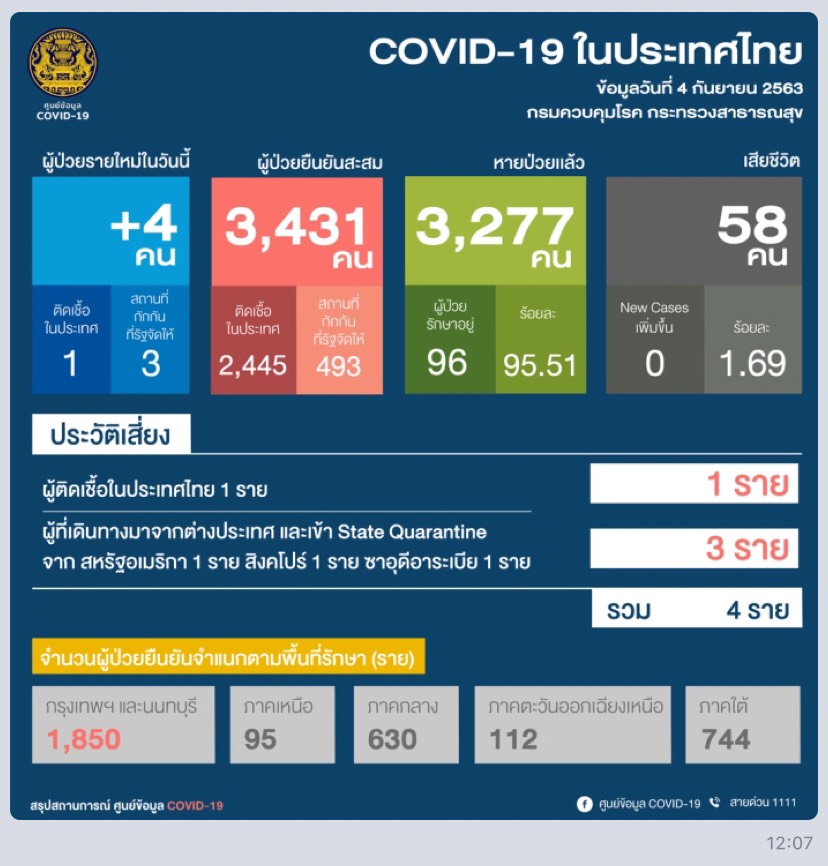 พบผู้ป่วยยืนยันติดเชื้อรายใหม่ 4 คน เป็นผู้ติดเชื้อในประเทศ 1 ราย และ 3 ราย เดินทางมาจากต่างประเทศ (สิงคโปร์ 1 ราย ซาอุดิอาระเบีย 1 ราย และสหรัฐ 1 ราย ) และเข้าพักใน State Quarantine
