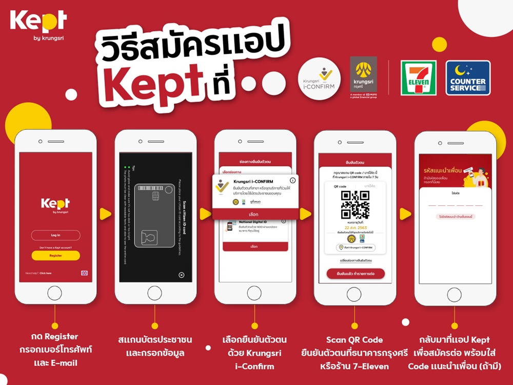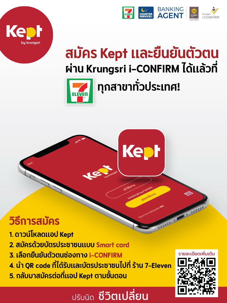 Kept by krungsri นวัตกรรมบริหารเงินแพลตฟอร์มใหม่ ชวนลูกค้าเริ่มเก็บออมเงินผ่านแอปพลิเคชั่น Kept สมัครได้ง่ายและสะดวกกว่าเดิมด้วยการเพิ่มช่องทางการยืนยันตัวตนผ่าน Krungsri i-Confirm ที่เคาน์เตอร์เซอร์วิสในร้าน 7-Eleven ทุกสาขาทั่วประเทศ สมัครแล้วโอนเงินเข้าบัญชีขั้นต่ำ 1,000 บาท ภายใน 7 วัน จะได้รับบัตรกำนัล e-Coupon สตาร์บัคส์ มูลค่า 100 บาท ตั้งแต่วันนี้ถึง 30 กันยายน 2563 ผ่านอีเมลที่ลงทะเบียนไว้