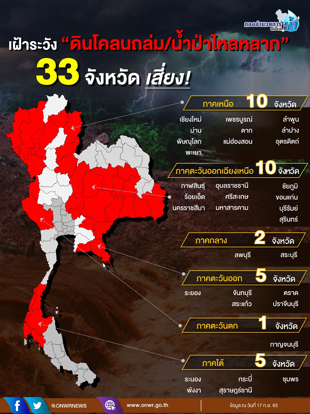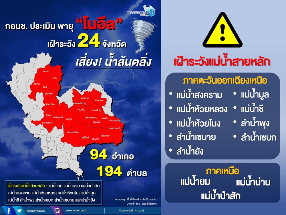 ทั้งนี้ เบื้องต้นกองอำนวยการน้ำแห่งชาติคาดการณ์ว่าจะมีพื้นที่เสี่ยงดินโคลนถล่มและน้ำป่าไหลหลาก รวม 33 จังหวัด ประกอบด้วย ภาคเหนือ 10 จังหวัด ภาคตะวันออกเฉียงเหนือ 10 จังหวัด ภาคกลาง 2 จังหวัด ภาคตะวันออก 5 จังหวัด ภาคตะวันตก 1 จังหวัด ภาคใต้ 5 จังหวัด และจังหวัดเสี่ยงน้ำล้นตลิ่งในลำน้ำหลายหลักใน 24 จังหวัด 94 อำเภอ 194 ตำบล แบ่งเป็น ภาคตะวันออกเฉียงเหนือ 15 จังหวัด และภาคเหนือ 9 จังหวัด ซึ่งในช่วงวันนี้ต้องเฝ้าระวังสถานการณ์ในแม่น้ำสาขา ก่อนที่ลำน้ำสายหลักจะเพิ่มระดับสูงขึ้นในวันถัดไป ประกอบด้วยภาคตะวันออกเฉียงเหนือ 9 แห่ง ได้แก่ แม่น้ำสงคราม แม่น้ำมูล แม่น้ำห้วยหลวง แม่น้ำชี แม่น้ำห้วยโมง ลำน้ำพุง ลำน้ำเซบาย ลำน้ำเซบก ลำน้ำยัง และ ในภาคเหนือ 3 แห่ง ได้แก่ แม่น้ำยม แม่น้ำน่าน แม่น้ำป่าสัก และสำหรับสถานการณ์ในแม่น้ำโขงนั้น ยืนยันว่าจะไม่ได้รับผลกระทบจากพายุ โดยระดับน้ำในแม่น้ำโขงจะเพิ่มขึ้นไม่เกิน 50 ซม.