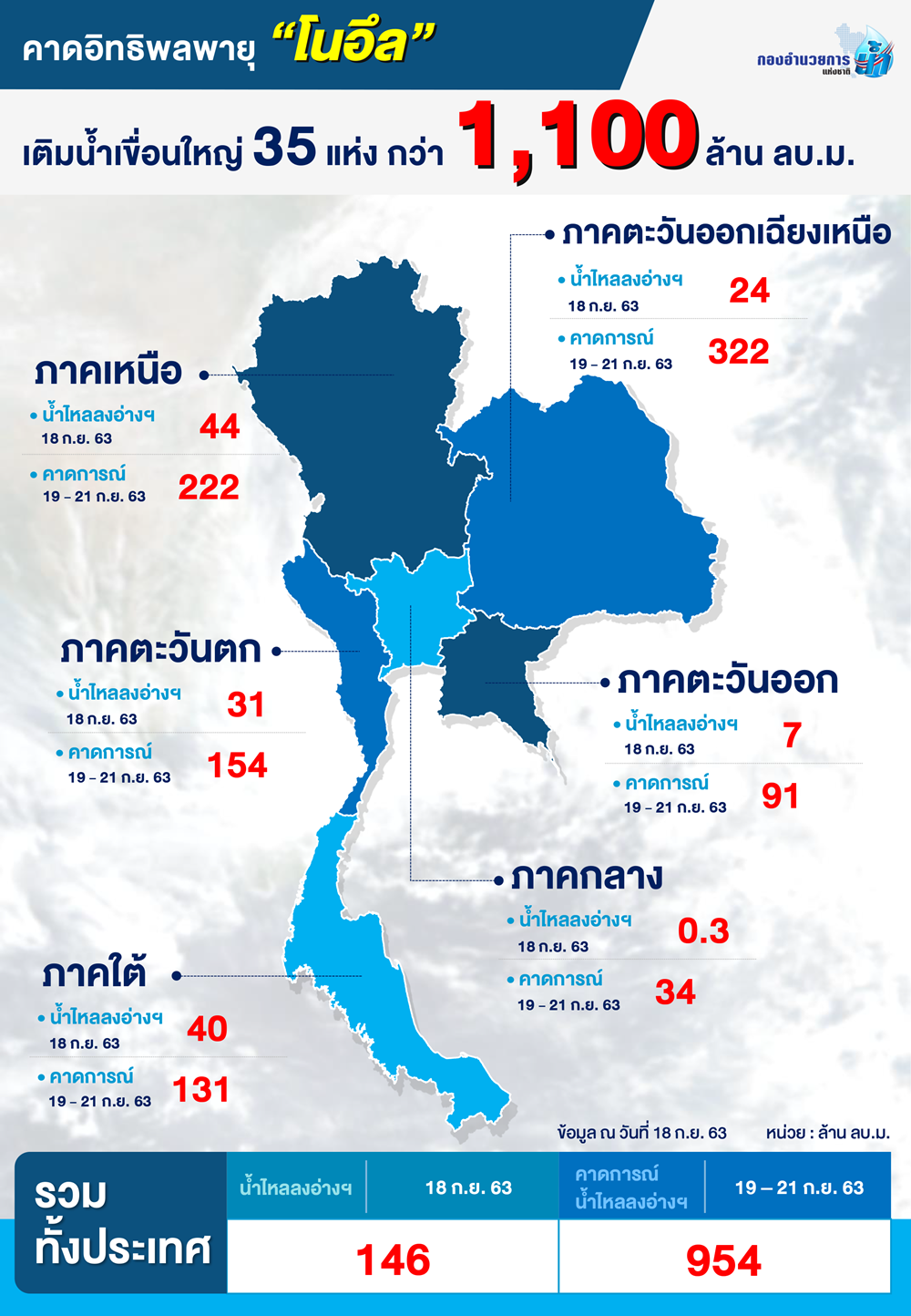 ดร.สมเกียรติ เปิดเผยเพิ่มเติมว่า นอกจากในแง่ของผลกระทบแล้ว กอนช.ยังประเมินถึงผลดีจากอิทธิพลของพายุโนอึลที่จะช่วยให้มีน้ำไหลเข้าอ่างเก็บน้ำมากขึ้น โดยคาดการณ์น้ำไหลเข้าอ่างเก็บน้ำขนาดใหญ่ 35 แห่ง ทั่วประเทศจากพายุโนอึล ในช่วงวันที่ 18-21 ก.ย. 63