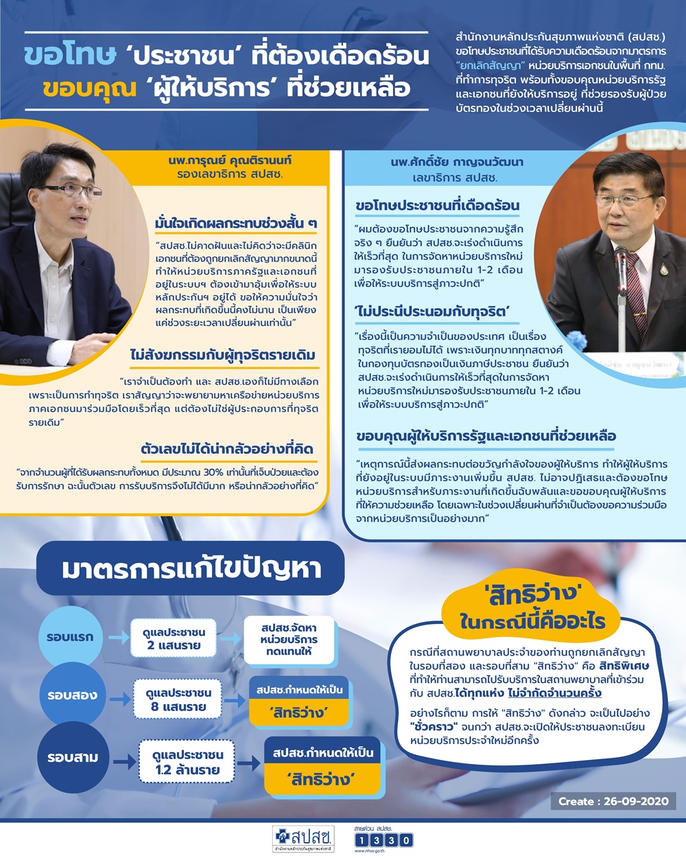 นพ.ศักดิ์ชัย กล่าวว่า เพื่อให้การเข้ารับบริการของผู้มีสิทธิที่หน่วยบริการประจำถูกยกเลิกสัญญาดังกล่าวสามารถเข้ารับบริการได้ทุกแห่งอย่างสะดวก โดยไม่จำกัดจำนวนครั้งและไม่ต้องเสียค่าใช้จ่าย สปสช.ได้ทำหนังสือแจ้งไปยังหน่วยบริการในระบบหลักประกันสุขภาพแห่งชาติทุกหน่วยแล้วเมื่อวันที่ 24 ก.ย.2563 ที่ผ่านมา หลังจากแจ้งไปแล้วครังแรกเมื่อวันที่ 18 กันยายน 2563 เพื่อขอความร่วมมืออำนวยความสะดวกในการให้บริการโดยยังไม่ต้องลงทะเบียนเลือกหน่วยบริการประจำและไม่ต้องใช้หนังสือส่งตัว ซึ่งค่าใช้จ่ายในการรักษาพยาบาลต่างๆ หน่วยบริการสามารถเบิกได้ได้จาก สปสช. ตามหลักเกณฑ์และเงื่อนไขที่กำหนด